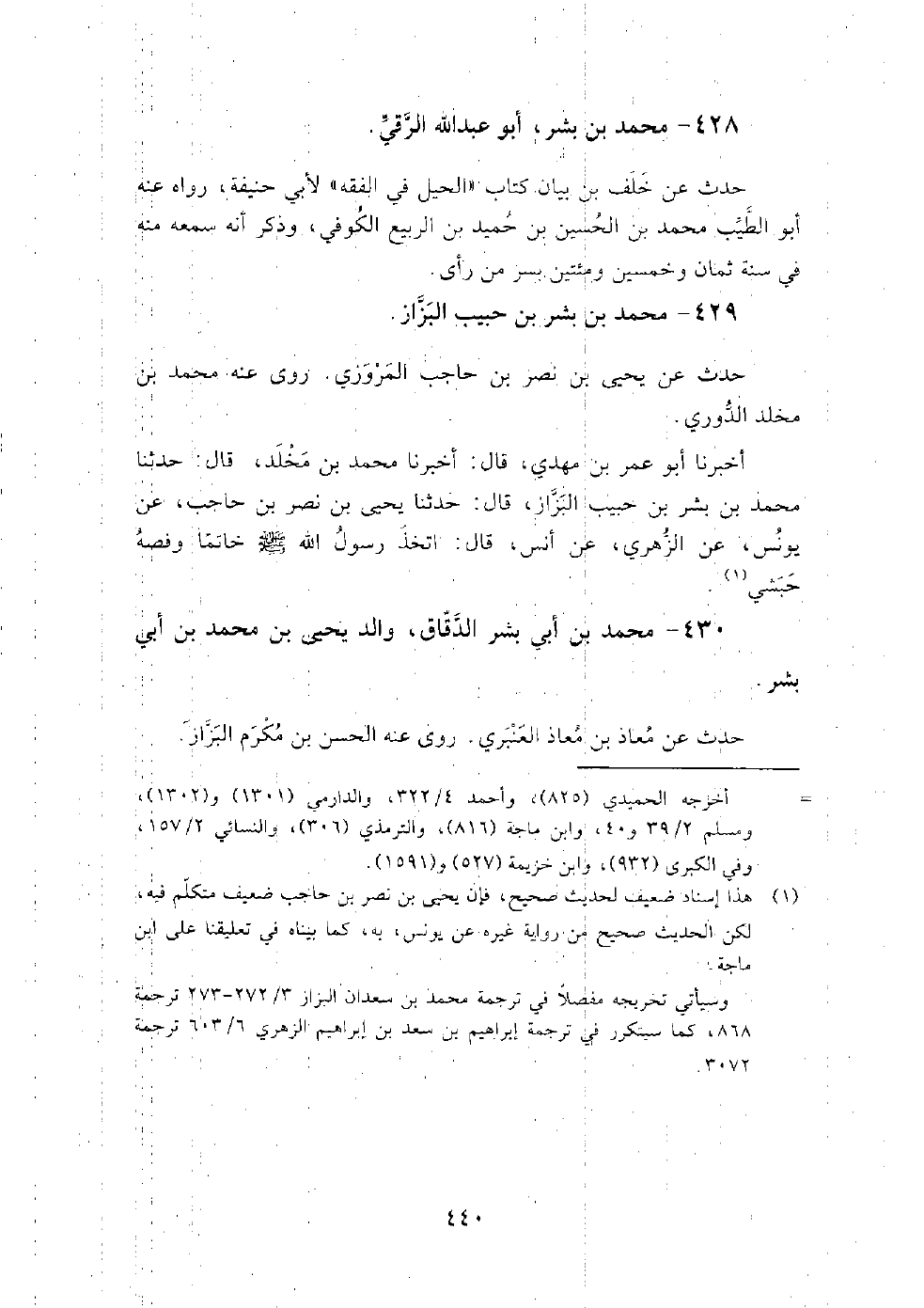 428 - محمد بن بشر أبو عبد الله الرقى حدث عن خلف بن بيان كتاب الحيل في الفقه لأبي حنيفة، رواه عنه أبو الطيب محمد بن الحسين بن حميد بن الربيع الكوفي، وذكر أنه سمعه منه في سنة ثمان وخمسين ومائتين، بسر من رأى.