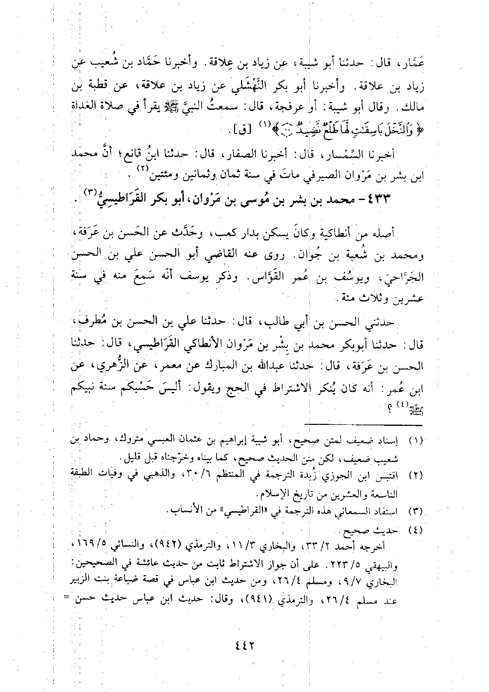 433 - محمد بن بشر بن موسى بن مروان أبو بكر القراطيسي أصله من أنطاكية وكان يسكن بدار كعب، وحدث عن الحسن بن عرفة، ومحمد بن شعبة بن جوان.
