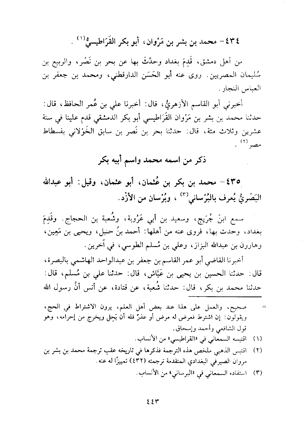 434 - محمد بن بشر بن مروان أبو بكر القراطيسي من أهل دمشق، قدم بغداد وحدث بها عن بحر بن نصر، والربيع بن سليمان المصريين.