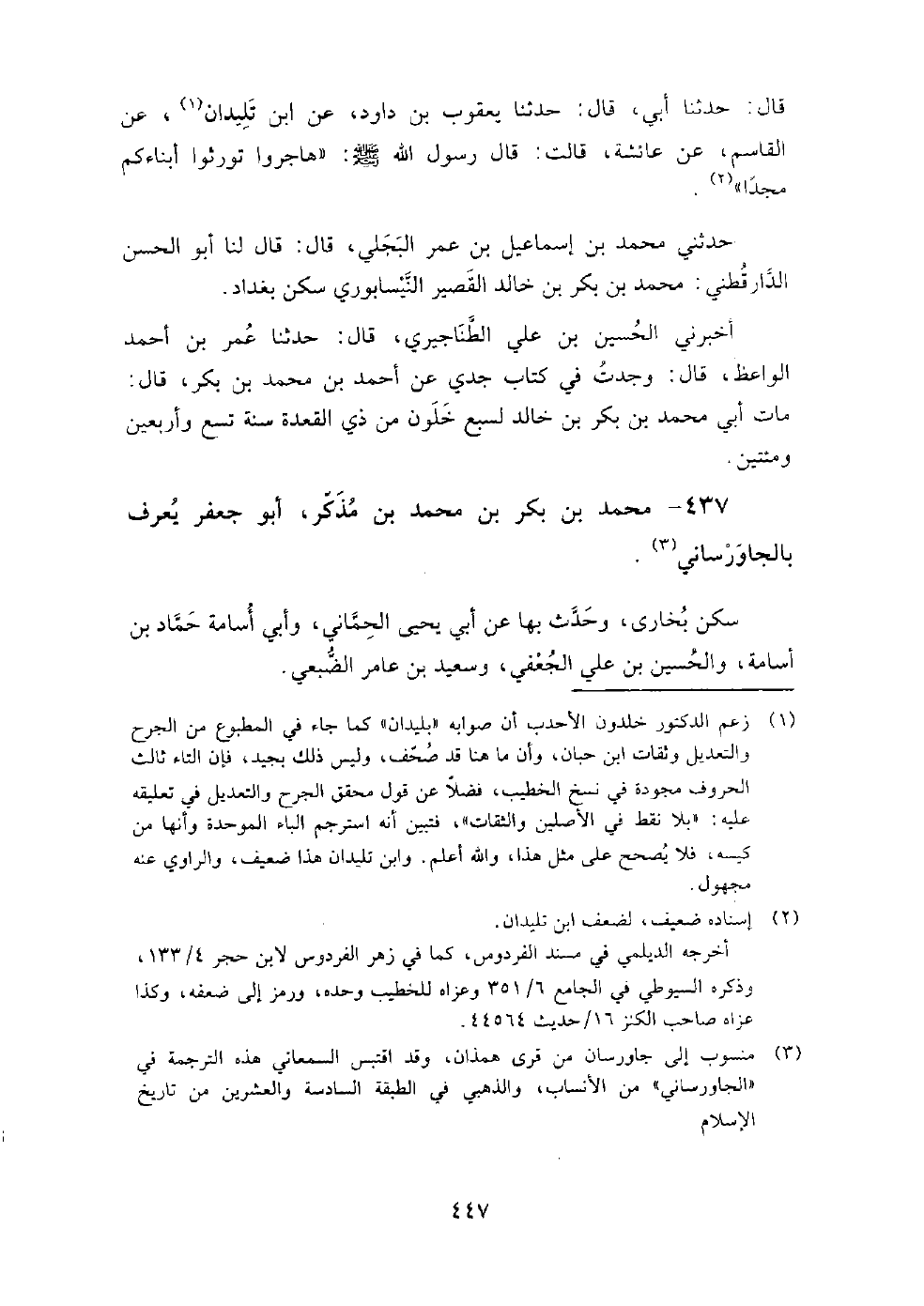 437 - محمد بن بكر بن محمد بن مذكر أبو جعفر يعرف بالجاورساني سكن بخارى، وحدث بها عن أبي يحيى الحماني، وأبي أسامة حماد بن أسامة، والحسين بن علي الجعفي، وسعيد بن عامر الضبعي.