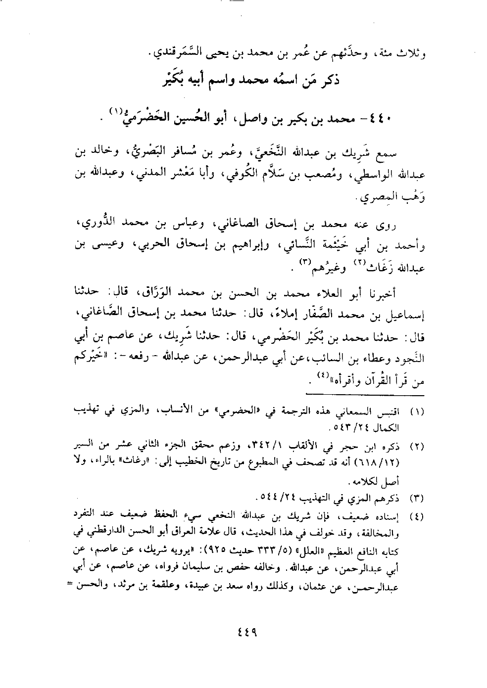 440 - محمد بن بكير بن واصل أبو الحسين الحضرمي سمع شريك بن عبد الله النخعي، وعمر بن مسافر البصري، وخالد بن عبد الله الواسطي، ومصعب بن سلام الكوفي، وأبا معشر المدني، وعبد الله بن وهب المصري.