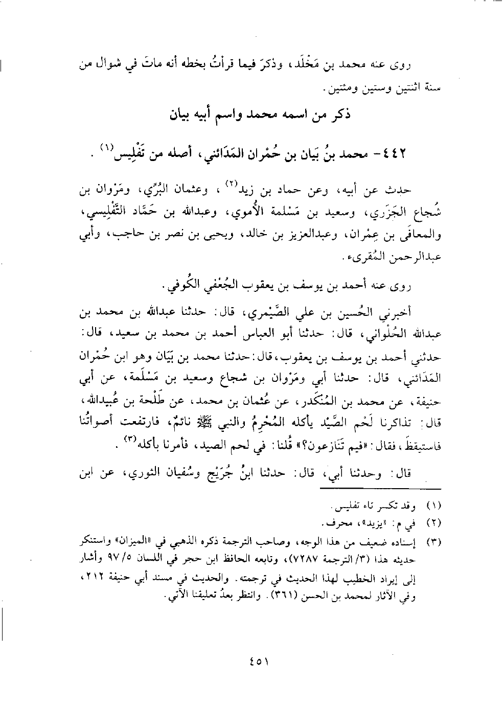 442 - محمد بن بيان بن حمران المدائني أصله من تفليس حدث عن أبيه، وعن حماد بن زيد، وعثمان البري، ومروان بن شجاع الجزري، وسعيد بن مسلمة الأموي، وعبد الله بن حماد التفليسي، والمعافى بن عمران، وعبد العزيز بن خالد، ويحيى بن نصر بن حاجب، وأبي عبد الرحمن المقرئ.
