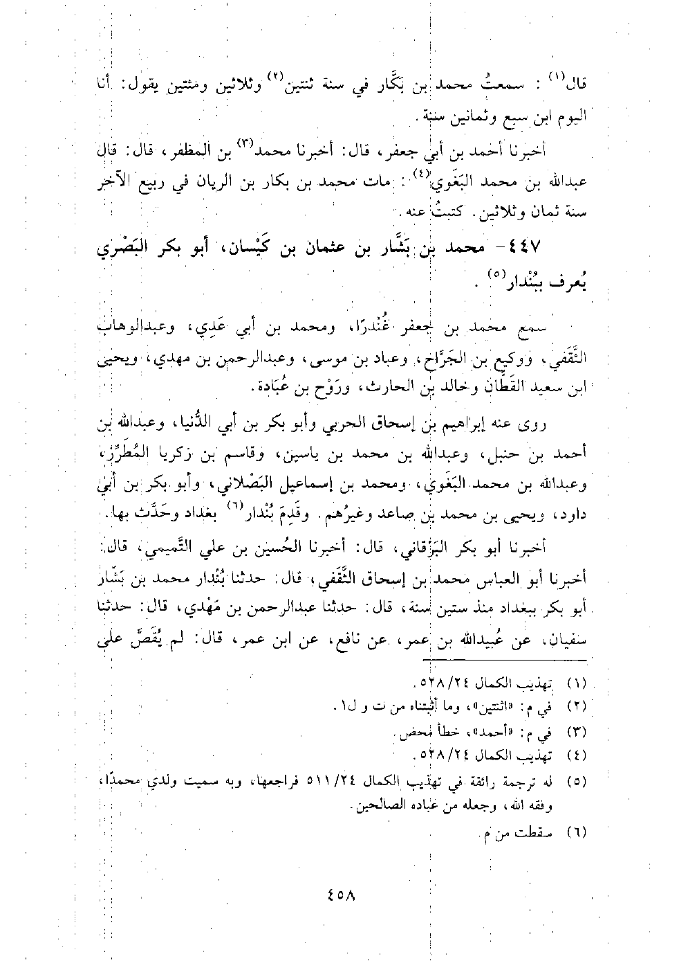 447 - محمد بن بشار بن عثمان بن كيسان أبو بكر البصري يعرف ببندار سمع محمد بن جعفر غندار، ومحمد بن أبي عدي، وعبد الوهاب الثقفي، ووكيع بن الجراح، وعباد بن موسى، وعبد الرحمن بن مهدي، ويحيى بن سعيد القطان، وخالد بن الحارث، وروح بن عبادة.