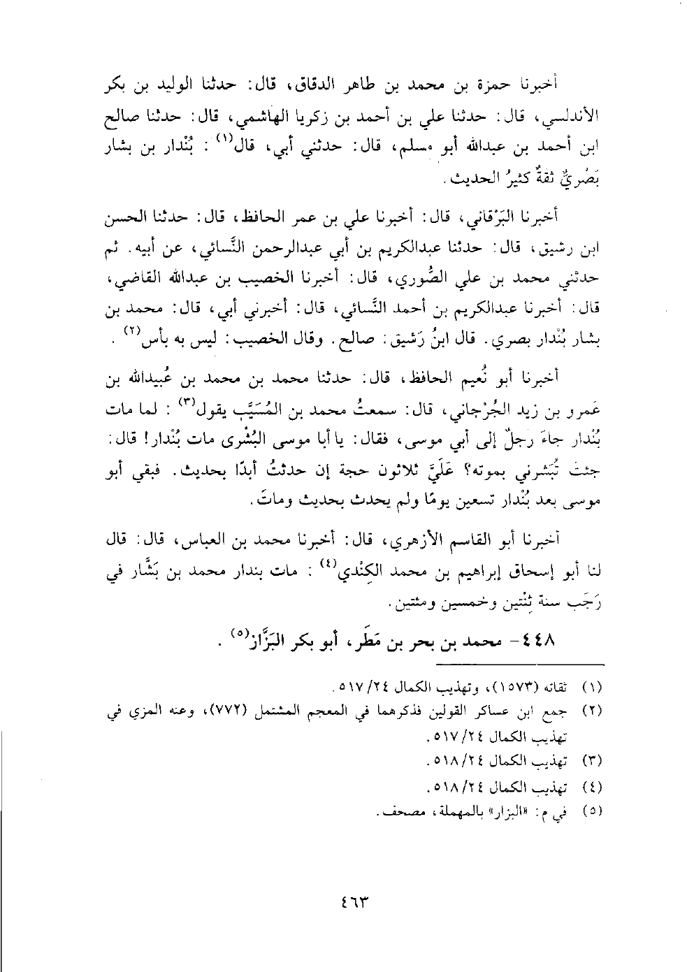 448 - محمد بن بحر بن مطر أبو بكر البزاز سمع يزيد بن هارون، وأبا بدر شجاع بن الوليد، وأبا النضر هاشم بن القاسم، والحسن بن قتيبة المدائني ومعمر بن مخلد السروجي.