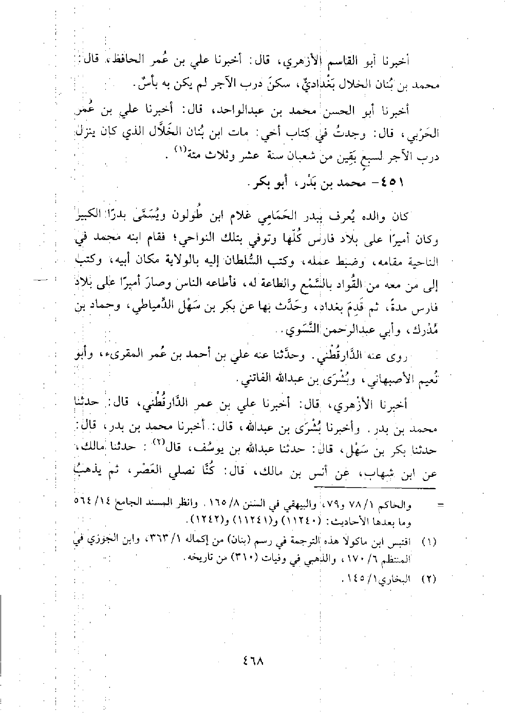 451 - محمد بن بدر أبو بكر كان والده يعرف ببدر الحمامي، غلام ابن طولون، ويسمى بدر الكبير، وكان أميرا على بلاد فارس كلها وتوفي بتلك النواحي، فقام ابنه محمد بن الناحية مقامه، وضبط عمله وكتب السلطان إليه بالولاية مكان أبيه، وكتب إلى من معه من القواد بالسمع والطاعة له، فأطاعه الناس وصار أميرا على بلاد فارس مدة، ثم قدم بغداد، وحدث بها عن بكر بن سهل الدمياطي، وحماد بن مدرك، وأبى عبد الرحمن النسوي.