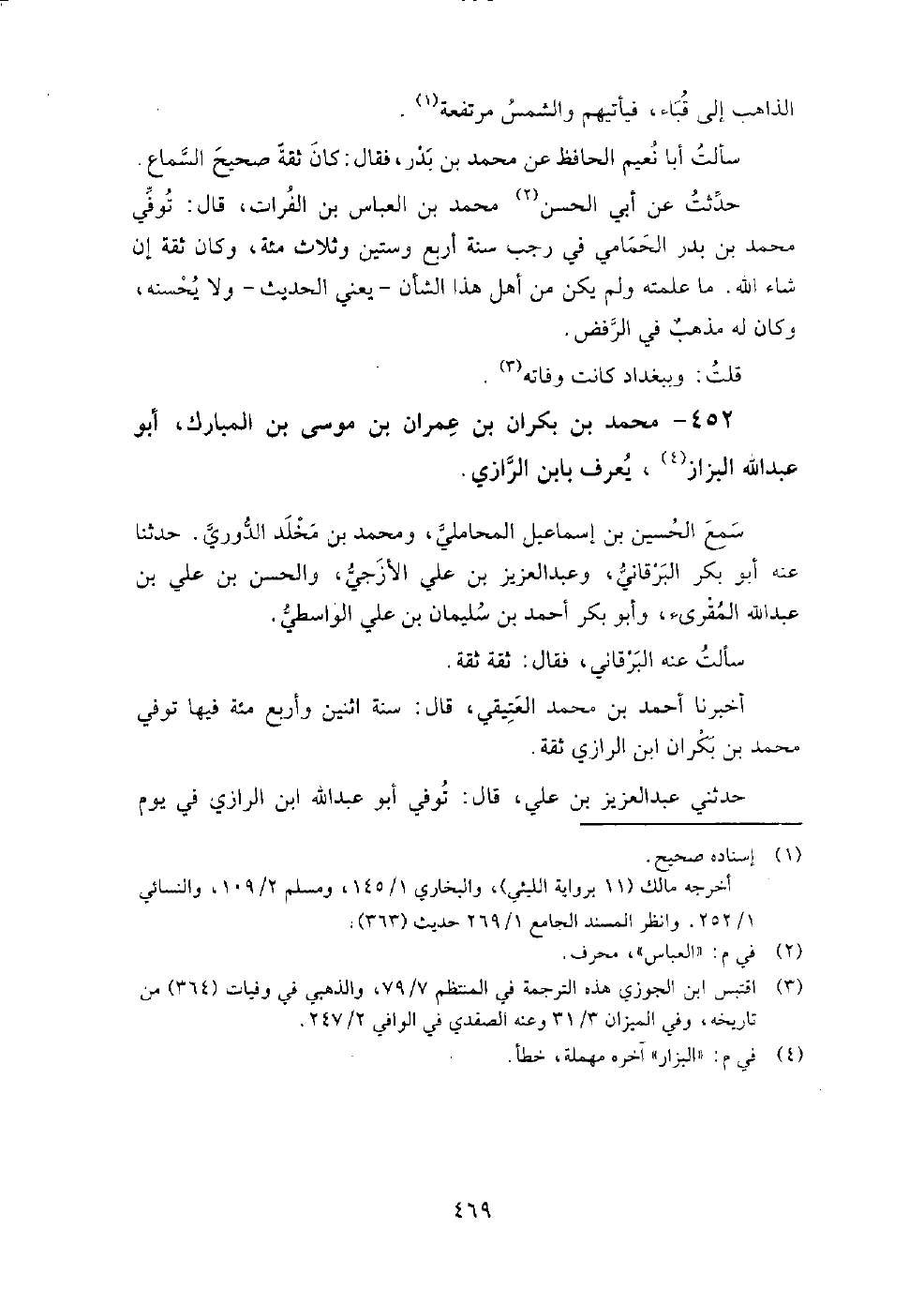 452 - محمد بن بكران بن عمران بن موسى بن المبارك أبو عبد الله البزاز يعرف بابن الرازي سمع الحسين بن إسماعيل المحاملي، ومحمد بن مخلد الدوري.
