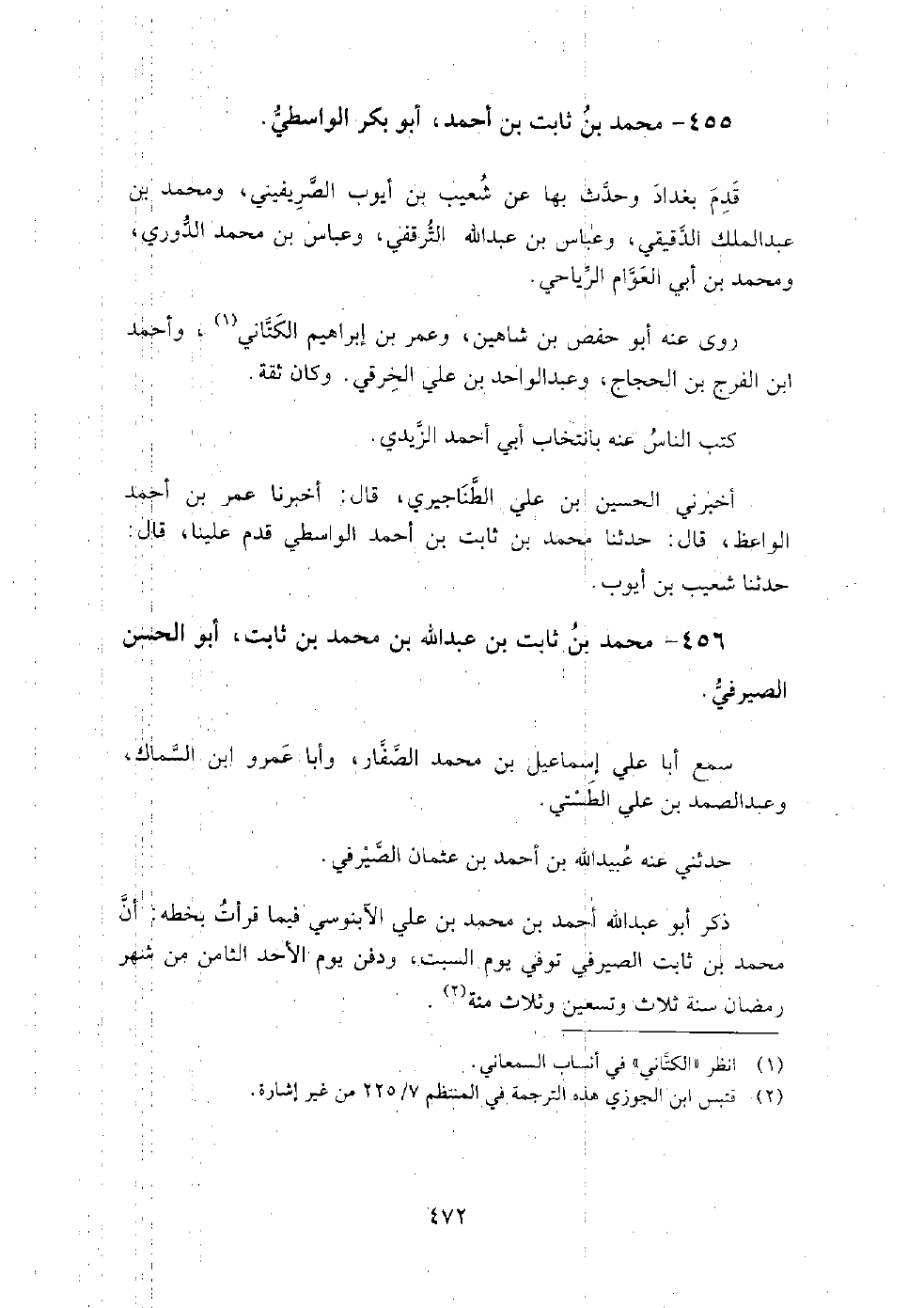 455 - محمد بن ثابت بن أحمد أبو بكر الواسطي قدم بغداد وحدث بها عن شعيب بن أيوب الصريفيني، ومحمد بن عبد الملك الدقيقي، وعباس بن عبد الله الترقفي، وعباس بن محمد الدوري، ومحمد بن أبي العوام الرياحي.
