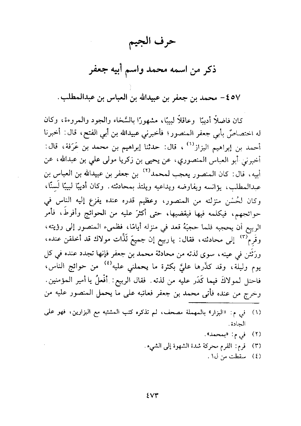 457 - محمد بن جعفر بن عبيد الله بن العباس بن عبد المطلب كان فاضلا أديبا وعاقلا لبيبا، مشهورا بالسخاء والجود والمروءة، وكان له اختصاص بأبي جعفر المنصور، فأخبرني عبيد الله بن أبي الفتح، قَالَ: أخبرنا أحمد بن إبراهيم البزاز، قَالَ: حدثنا إبراهيم بن محمد بن عرفة، قَالَ: أَخْبَرَنِي أبو العباس المنصوري، عن يحيى بن زكريا مولى علي بن عبد الله، عن أبيه، قَالَ: كان المنصور يعجب لمحمد بن جعفر بن عبيد الله بن العباس بن عبد المطلب يؤانسه، ويفاوضه، ويداعبه، ويلتذ بمحادثته، وكان أديبا لبيبا لسنا، وكان لحسن منزلته من المنصور، وعظيم قدره عنده يفزع إليه الناس في حوائجهم، فيكلمه فيها فيقضيها، حتى أكثر عليه من الحوائج، وأفرط فأمر الربيع أن يحجبه، فلما حجبه قعد في منزله أياما، فظمئ المنصور إلى رؤيته، وقرم إلى محادثته، فقال: يا ربيع، إن جميع لذات مولاك قد أخلقن عنده، ورثثن في عينه سوى لذته من محادثة محمد بن جعفر، فإنها تجدد عنده في كل يوم وليلة، وقد كدرها على بكثرة ما يحملني عليه من حوائج الناس، فاحتل لمولاك فيما كدر عليه من لذته، فقال الربيع: أفعل يا أمير المؤمنين.