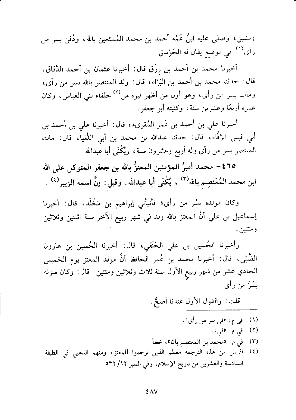 465 - محمد أمير المؤمنين المعتز بالله بن جعفر المتوكل على الله بن محمد المعتصم بالله يكنى أبا عبد الله وقيل إن اسمه الزبير، وكان مولده بسر من أرى، فأنبأني إبراهيم بن مخلد، قَالَ: أخبرنا إسماعيل بن علي أن المعتز بالله ولد في شهر ربيع الأخر سنة اثنتين وثلاثين ومائتين.