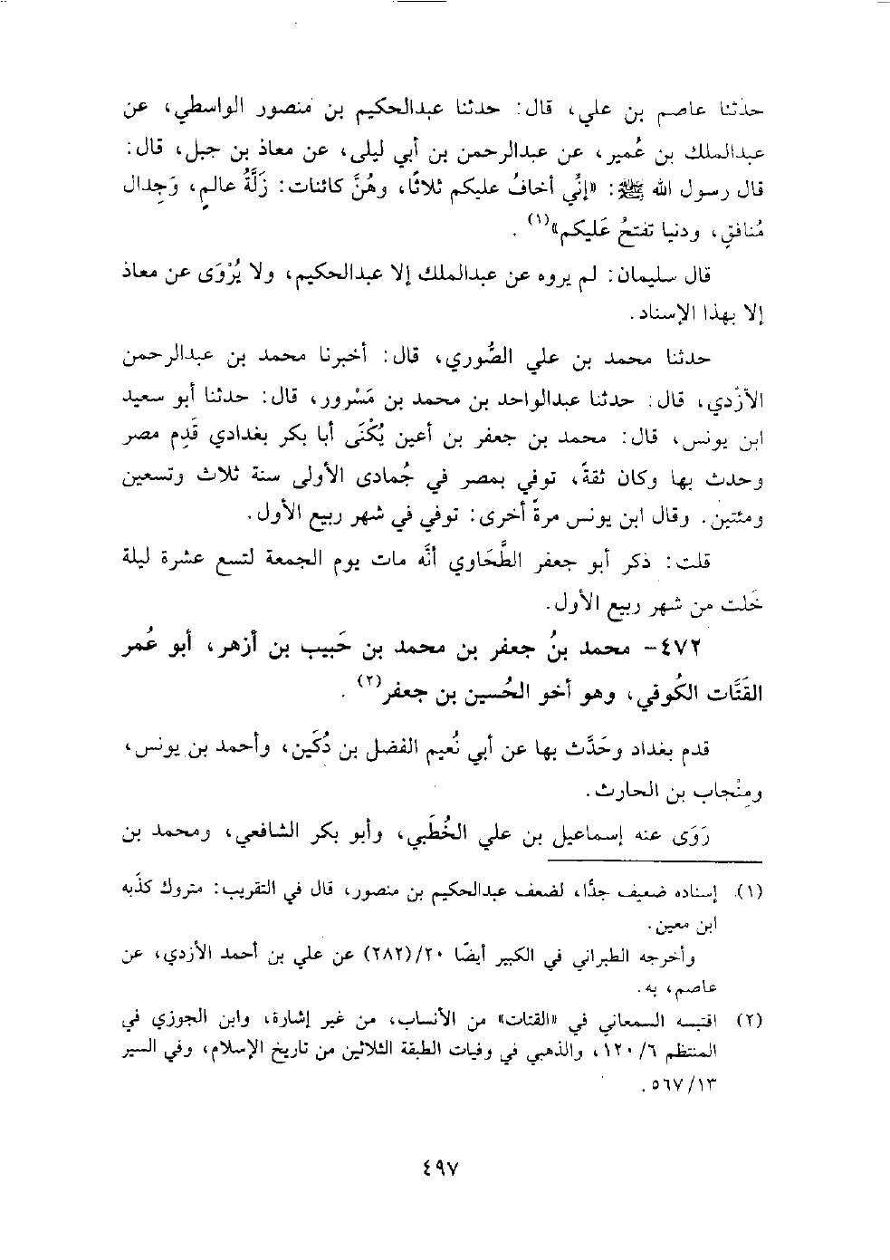 472 - محمد بن جعفر بن محمد بن حبيب بن أزهر أبو عمر القتات الكوفي وهو أخو الحسين بن جعفر، قدم بغداد وحدث بها عن أبي نعيم الفضل بن دكين، وأحمد بن يونس، ومنجاب بن الحارث.