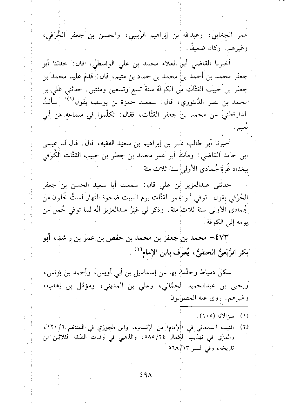 473 - محمد بن جعفر بن محمد بن حفص بن عمر بن راشد أبو بكر الربعي الحنفي، يعرف بابن الإمام سكن دمياط وحدث بها عن إسماعيل بن أبي أويس، وأحمد بن يونس، ويحيى بن عبد الحميد الحماني، وعلي ابن المديني، ومؤمل بن إهاب، وغيرهم.