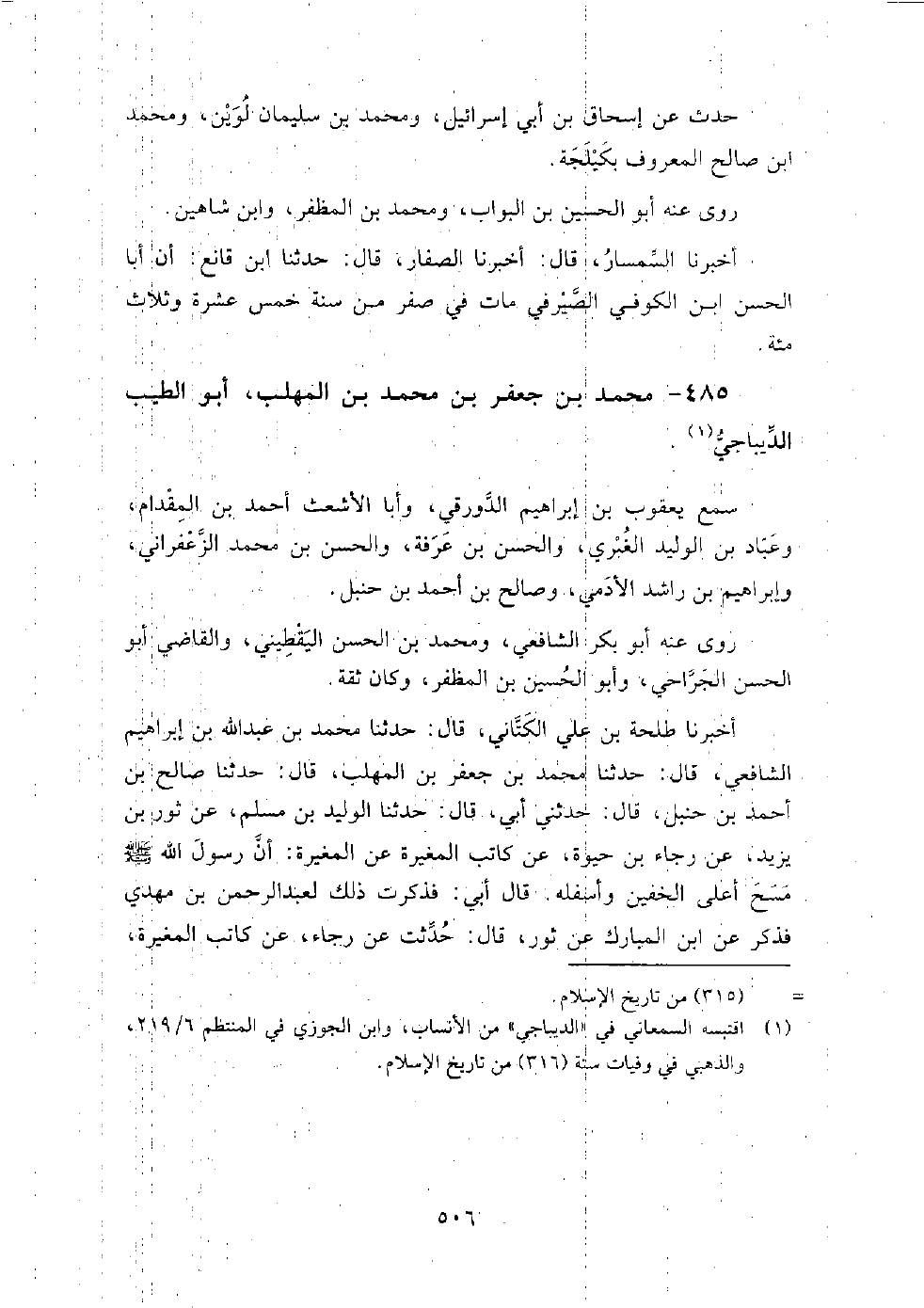 485 - محمد بن جعفر بن محمد بن المهلب أبو الطيب الديباجي سمع يعقوب بن إبراهيم الدورقي، وأبا الأشعث أحمد بن المقدام، وعباد بن الوليد الغبري، والحسن بن عرفة، والحسن بن محمد الزعفراني، وإبراهيم بن راشد الأدمي، وصالح بن أحمد بن حنبل.