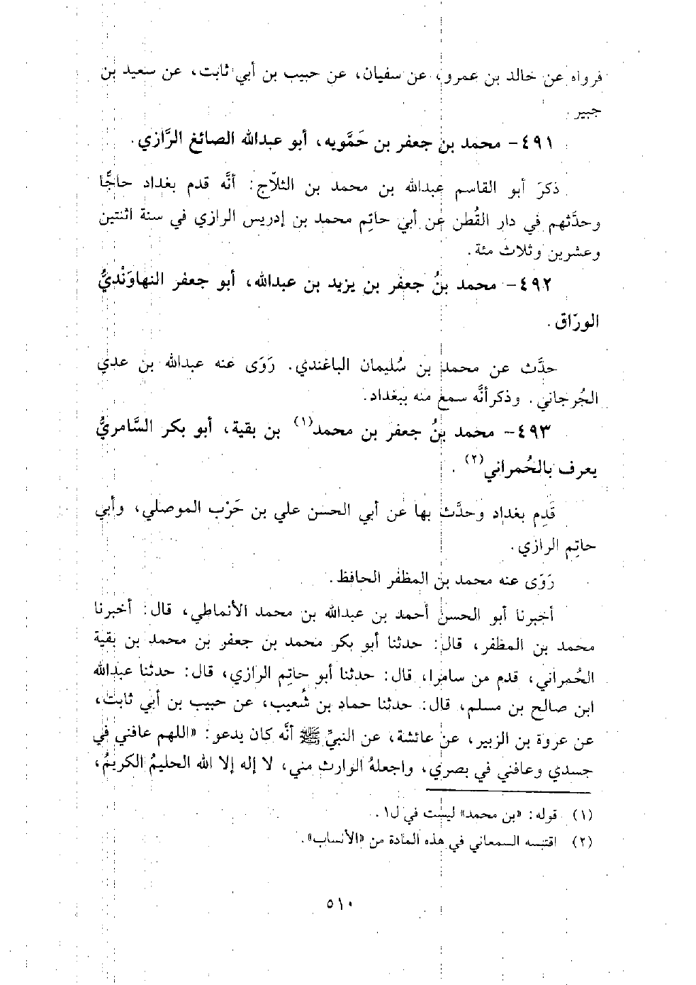 491 - محمد بن جعفر بن حمويه أبو عبد الله الصائغ الرازي ذكر أبو القاسم عبد الله بن محمد ابن الثلاج، أنه قدم بغداد حاجا، وحدثهم في دار القطن، عن أبي حاتم محمد بن إدريس الرازي في سنة اثنتين وعشرين وثلاث مائة.