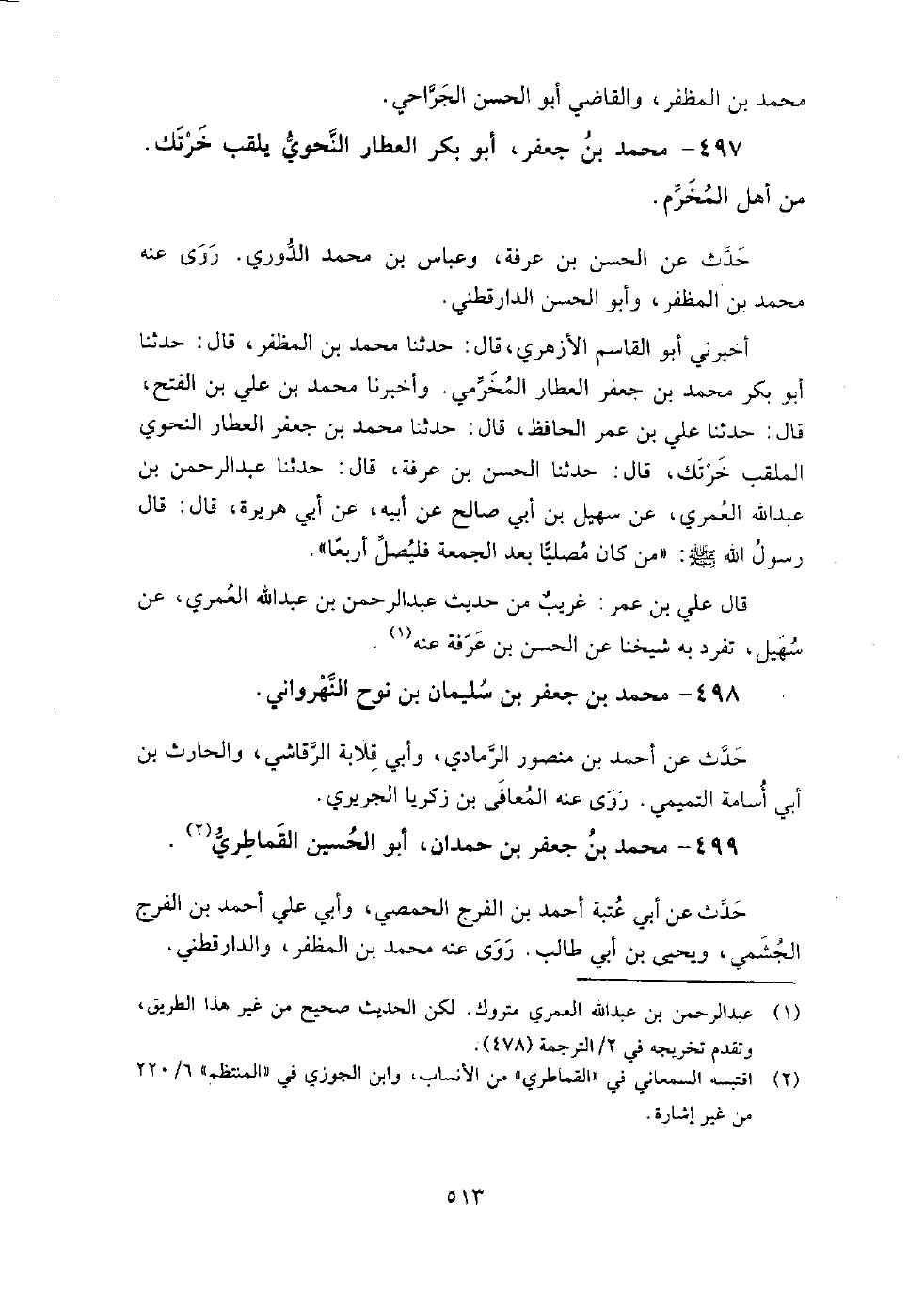 499 - محمد بن جعفر بن حمدان أبو الحسين القماطري حدث عن أبي عتبة أحمد بن الفرج الحمصي، وأبي علي أحمد بن الفرج الجشمي، ويحيى بن أبي طالب.