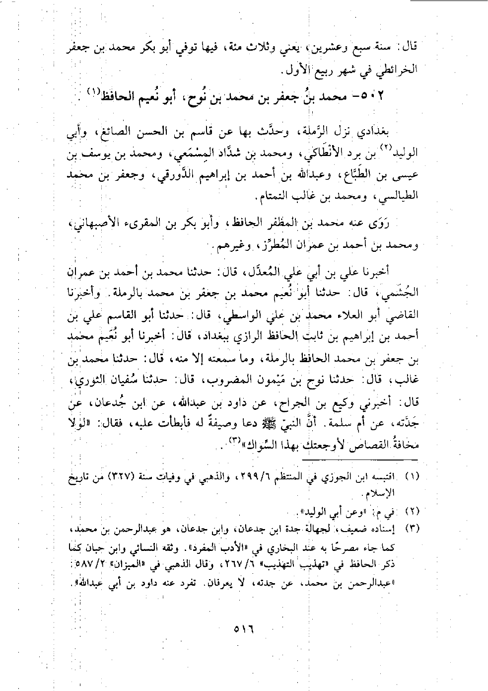 502 - محمد بن جعفر بن محمد بن نوح أبو نعيم الحافظ بغدادي نزل الرملة، وحدث بها عن قاسم بن الحسن الصائغ، وأبي الوليد بن برد الأنطاكي، ومحمد بن شداد المسمعي، ومحمد بن يوسف بن عيسى ابن الطباع، وعبد الله بن أحمد بن إبراهيم الدورقي، وجعفر بن محمد الطيالسي، ومحمد بن غالب التمتام.
