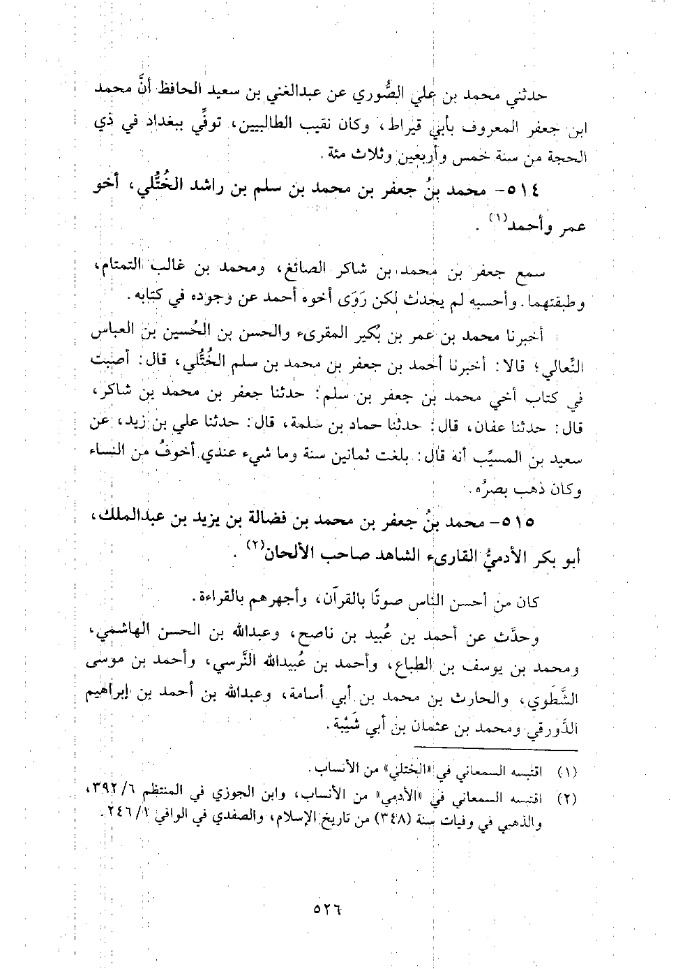 514 - محمد بن جعفر بن محمد بن سلم بن راشد الختلي، أخو عمر وأحمد سمع جعفر بن محمد بن شاكر الصائغ، ومحمد بن غالب التمتام، وطبقتهما.