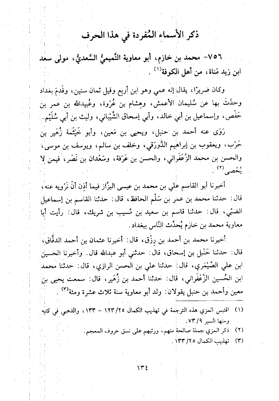 756 - محمد بن خازم أبو معاوية التميمي السعدي مولى سعد بن زيد مناة من أهل الكوفة، وكان ضريرا، يقال: إنه عمي وهو ابن أربع، وقيل: ثمان سنين، وقدم بغداد وحدث بها عن سليمان الأعمش، وهشام بن عروة، وعبيد الله بن عمر بن حفص، وإسماعيل بن أبي خالد، وأبي إسحاق الشيباني، وليث بن أبي سليم.
