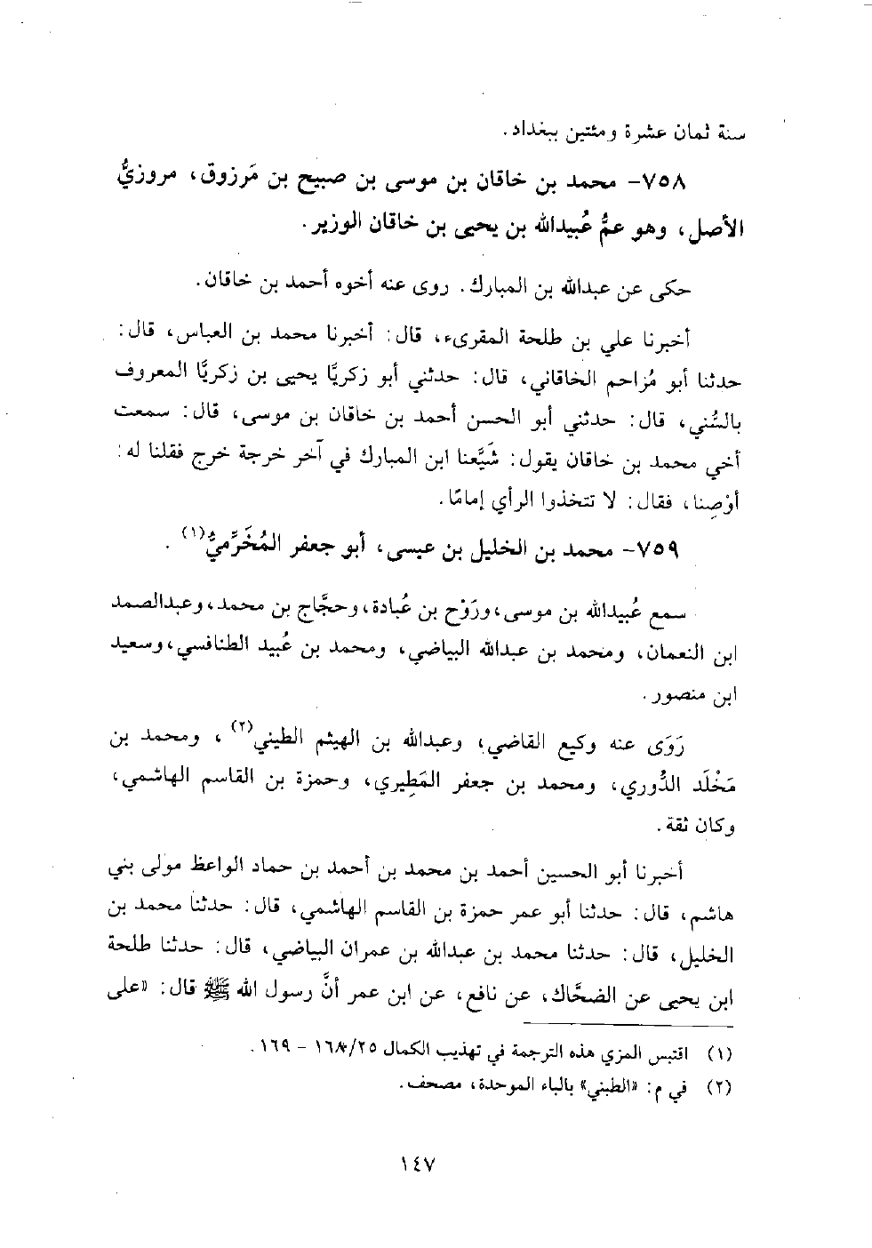 758 - محمد بن خاقان بن موسى بن صبيح بن مرزوق مروزي الأصل وهو عم عبيد الله بن يحيى بن خاقان الوزير، حكى عن: عبد الله بن المبارك، روى عنه: أخوه أحمد بن خاقان.
