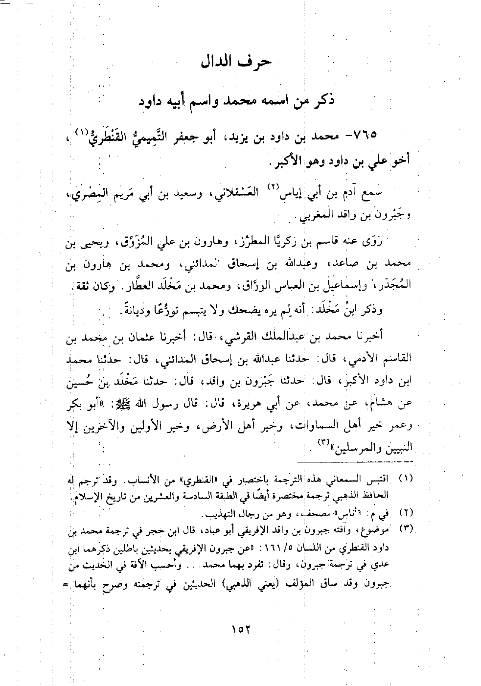 765 - محمد بن داود بن يزيد أبو جعفر التميمي القنطري أخو علي بن داود وهو الأكبر سمع: آدم بن أبي إياس العسقلاني، وسعيد بن أبي مريم المصري، وجبرون بن واقد المغربي.
