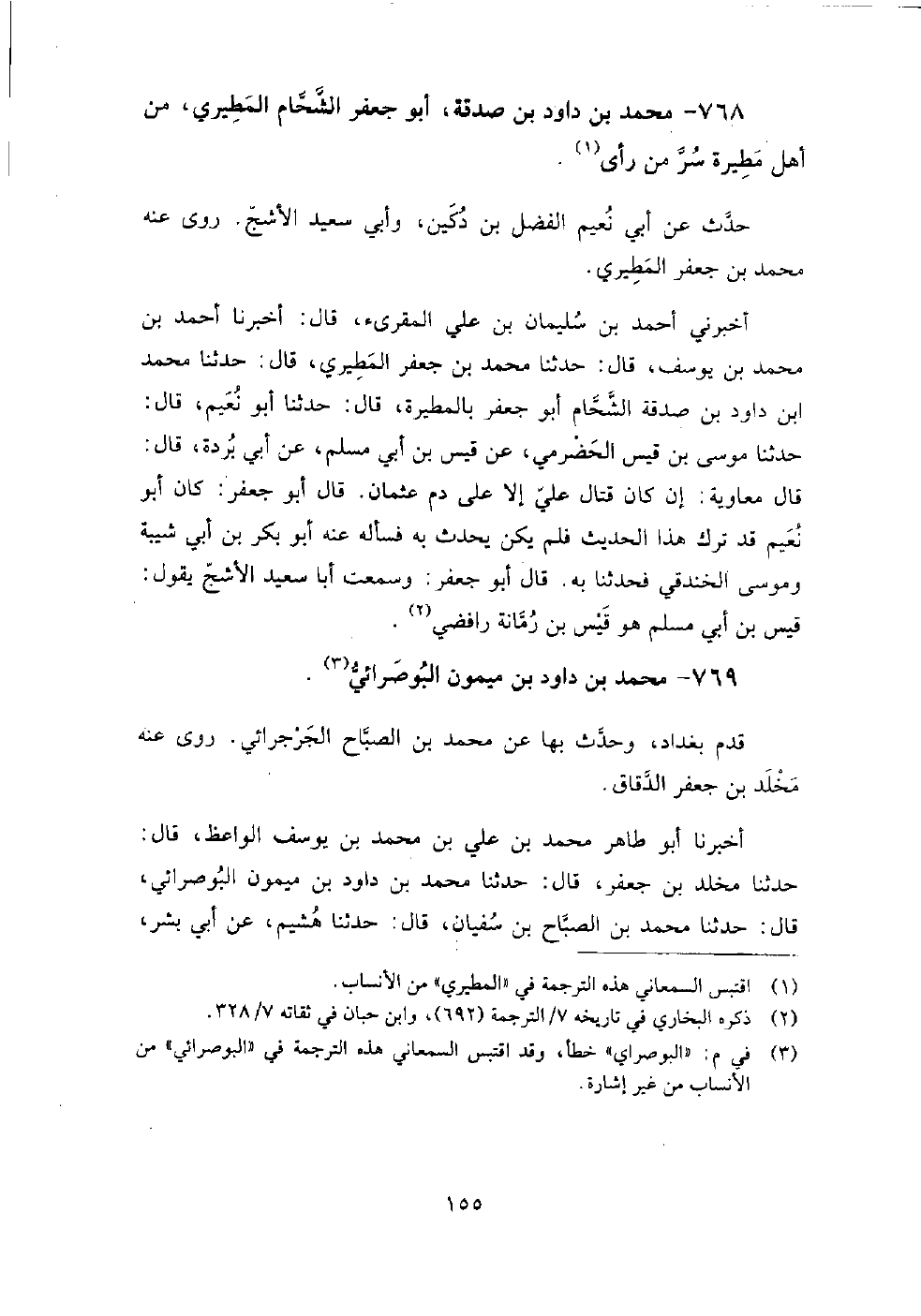 768 - محمد بن داود بن صدقة أبو جعفر الشحام المطيري من أهل مطيرة سر من رأى، حدث عن: أبي نعيم الفضل بن دكين، وأبي سعيد الأشج.