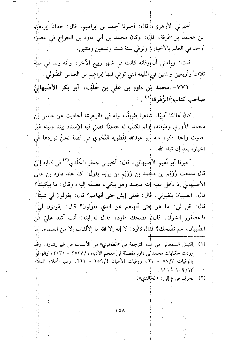 771 - محمد بن داود بن علي بن خلف أبو بكر الأصبهاني صاحب كتاب الزهرة، كان عالما أديبا، شاعرا ظريفا، وله في الزهرة أحاديث عن عباس بن محمد الدوري وطبقته، ولم نكتب له حديثا اتصل فيه الإسناد بيننا وبينه غير حديث واحد ذكره عنه أبو عبد الله نفطويه النحوي في قصة نحن نوردها في أخباره بعد إن شاء الله.