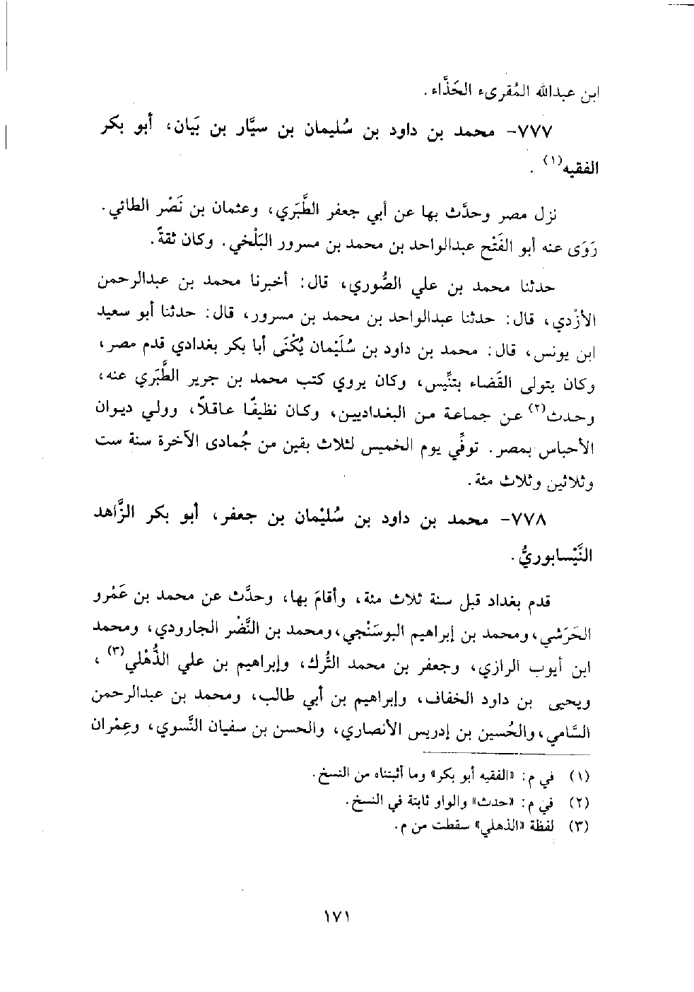 777 - محمد بن داود بن سليمان بن سيار بن بيان أبو بكر الفقيه نزل مصر، وحدث بها عن: أبي جعفر الطبري، وعثمان بن نصر الطائي.
