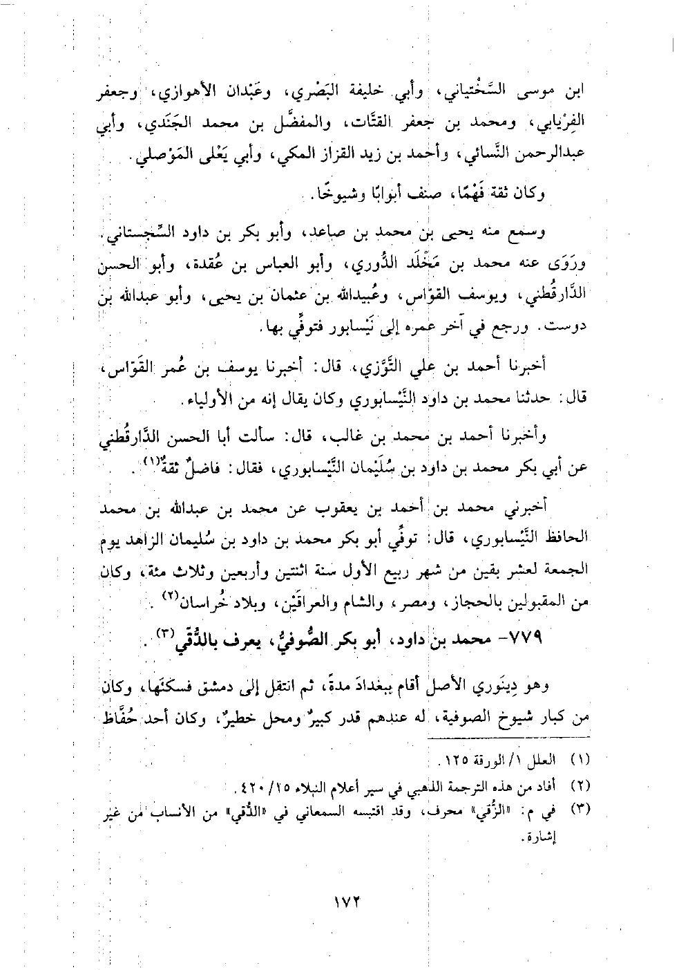 779 - محمد بن داود أبو بكر الصوفي يعرف بالدقي وهو دينوري الأصل، أقام ببغداد مدة، ثم انتقل إلى دمشق فسكنها، وكان من كبار شيوخ الصوفية، له عندهم قدر كبير ومحل خطير، وكان أحد حفاظ القرآن، قرأ على أبي بكر بن مجاهد وسمع من: محمد بن جعفر الخرائطي.