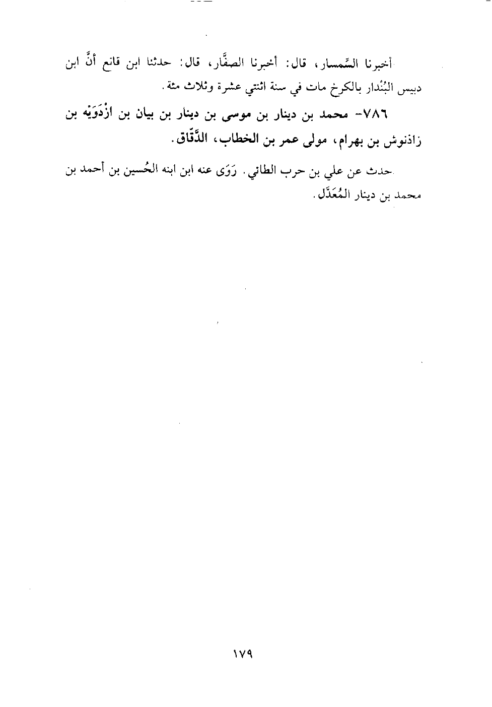 786 - محمد بن دينار بن موسى بن دينار بن بيان بن أزدويه بن زاذنوش بن بهرام مولى عمر بن الخطاب الدقاق حدث عن: علي بن حرب الطائي، روى عنه: ابن ابنه الحسين بن أحمد بن محمد بن دينار المعدل.