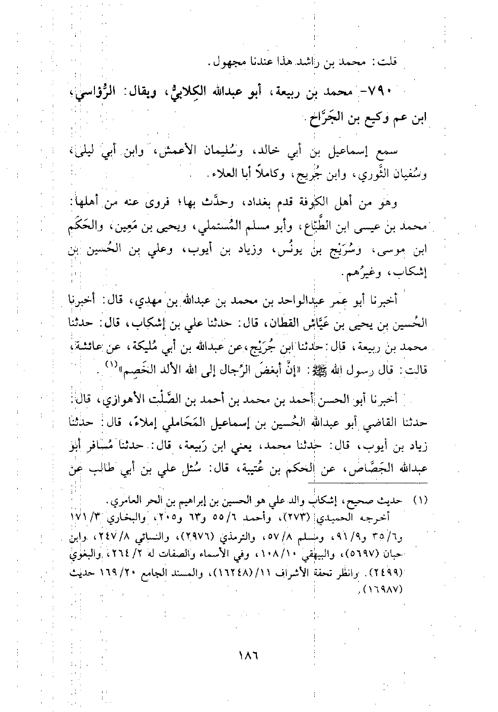 790 - محمد بن ربيعة أبو عبد الله الكلابي ويقال الرؤاسي ابن عم وكيع بن الجراح سمع: إسماعيل بن أبي خالد، وسليمان الأعمش، وابن أبي ليلى، وسفيان الثوري، وابن جريج، وكاملا أبا العلاء.