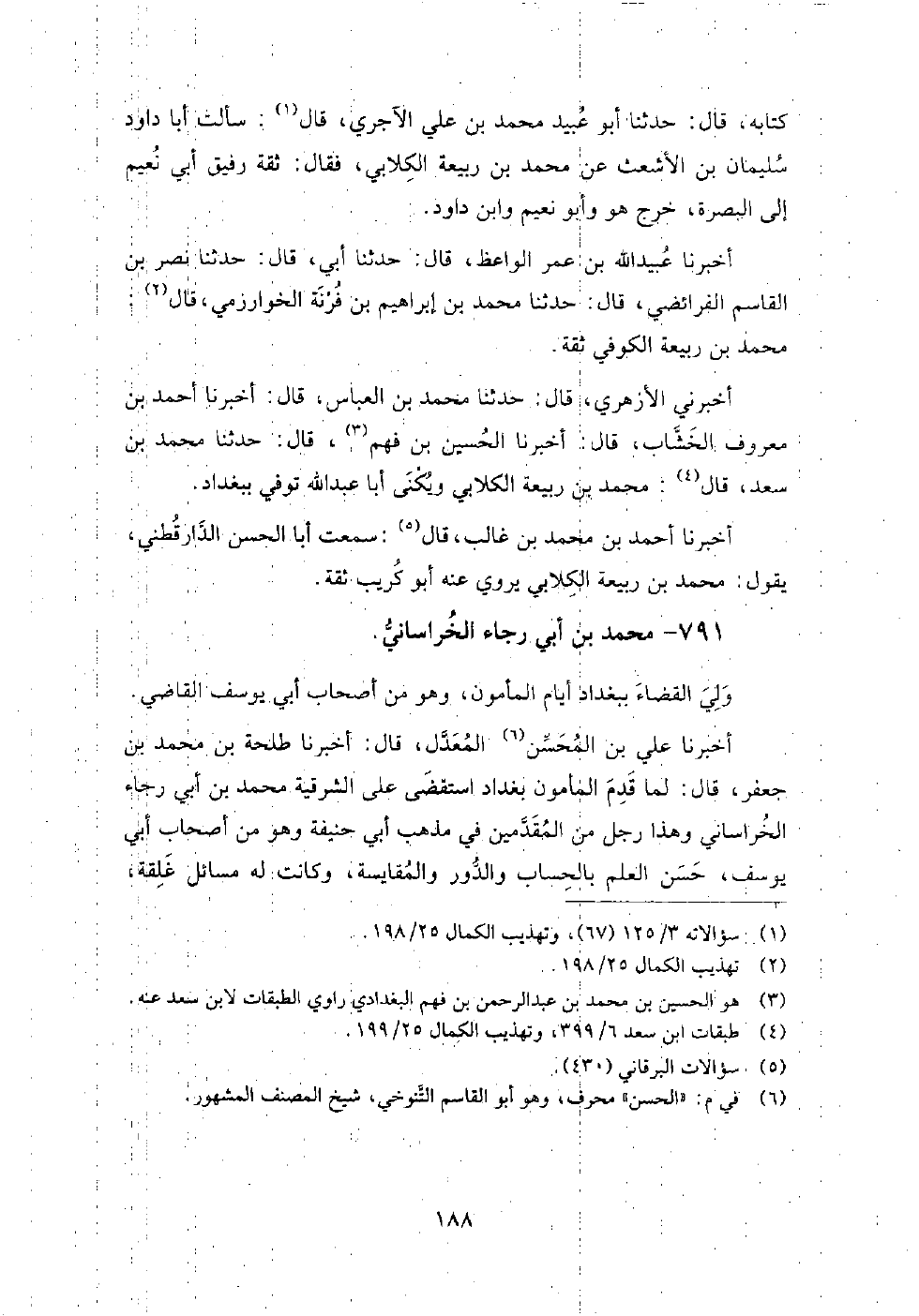 أَخْبَرَنَا علي بن المحسن المعدل، قَالَ: أَخْبَرَنَا طلحة بن محمد بن جعفر، قَالَ: لما قدم المأمون بغداد استقضى على الشرقية محمد بن أبي رجاء الخراساني، وهذا رجل من المقدمين في مذهب أبي حنيفة، وهو من أصحاب أبي يوسف، حسن العلم بالحساب والدور والمقايسة، وكانت له مسائل غلقة، ومات سنة سبع ومائتين؛ فضم عمله إلى محمد بن سماعة، وهو قاض على مدينة المنصور أَنْبَأَنَا إبراهيم بن مخلد، قَالَ: أَخْبَرَنَا عبد الله بن إسحاق البغوي، قَالَ: أَخْبَرَنَا الحارث بن محمد، قَالَ: حَدَّثَنَا محمد بن سعد، قَالَ: سنة سبع ومائتين فيها مات محمد بن أبي رجاء القاضي ببغداد يوم الجمعة لثلاث عشرة بقيت من جمادى الآخرة