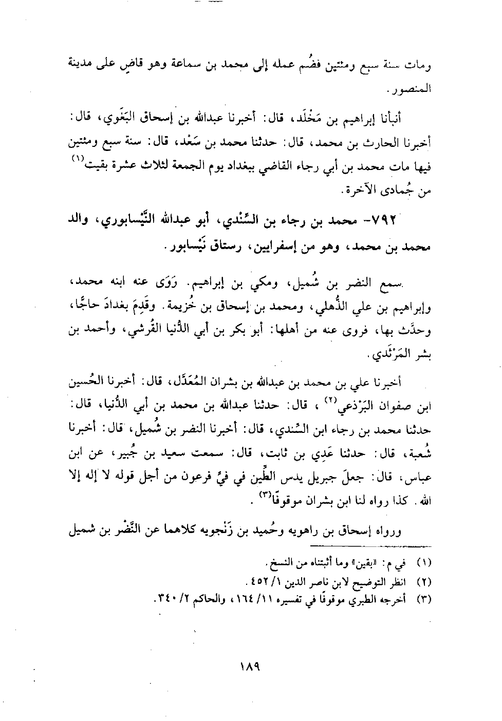792 - محمد بن رجاء بن السندي أبو عبيد الله النيسابوري والد محمد بن محمد وهو من إسفرايين رستاق نيسابور سمع: النضر بن شميل، ومكي بن إبراهيم.