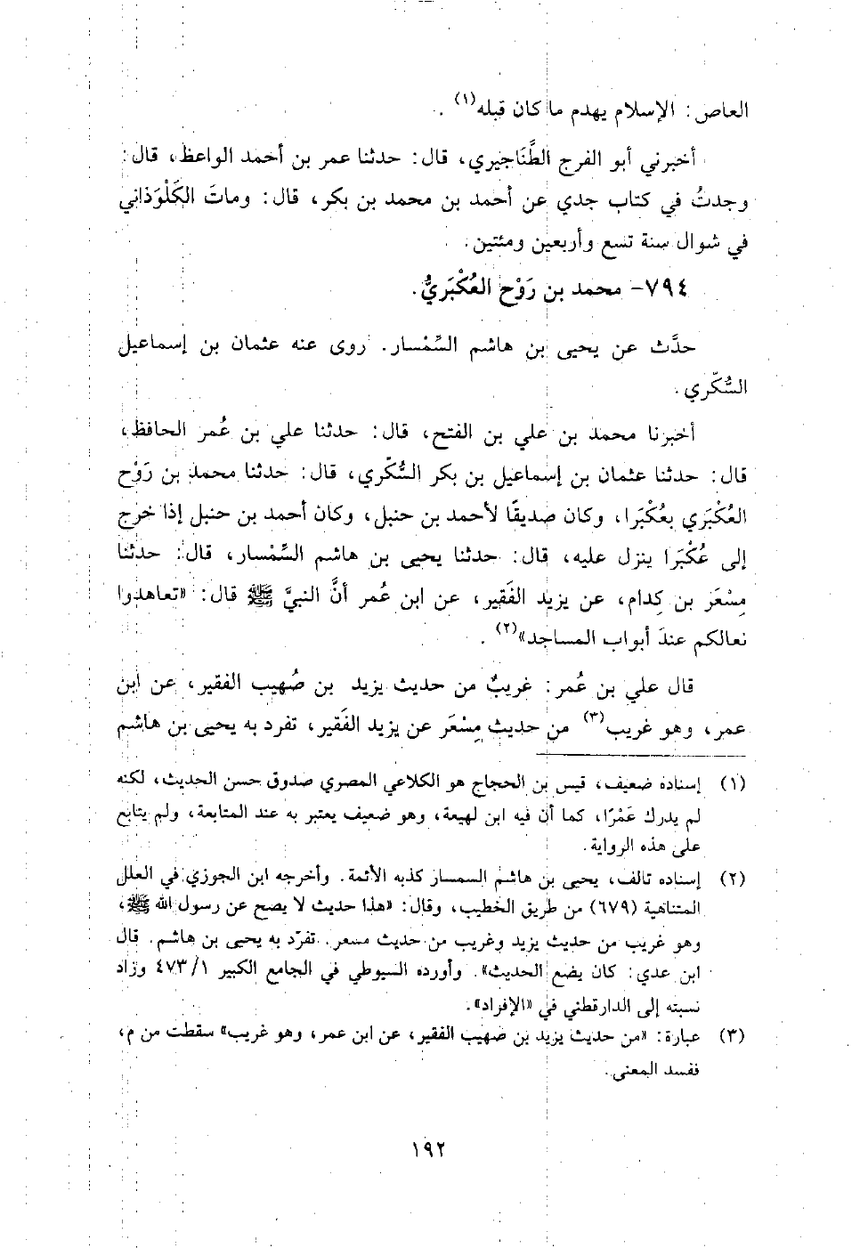 794 - محمد بن روح العكبري حدث عن: يحيى بن هاشم السمسار، روى عنه: عثمان بن إسماعيل السكري.