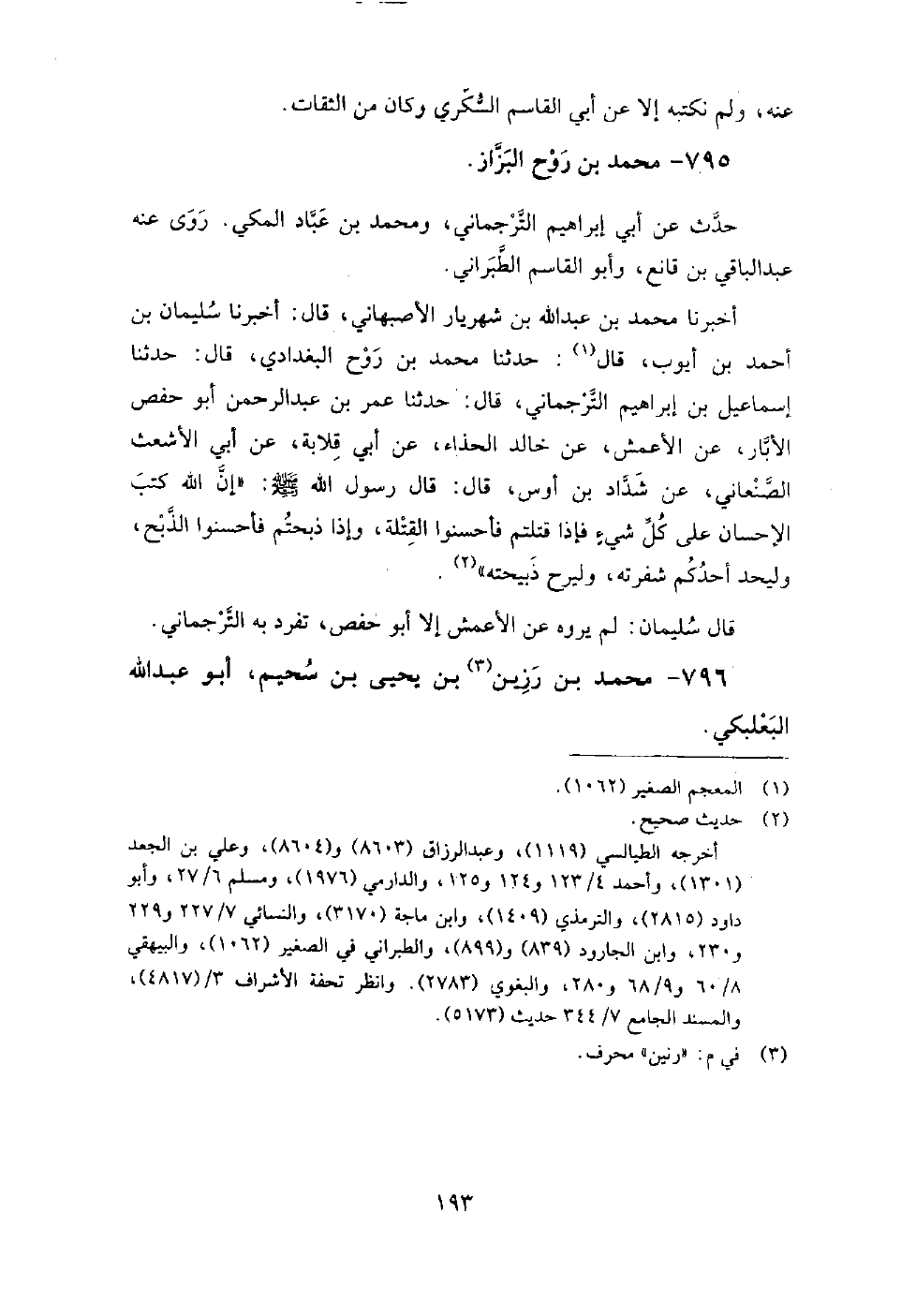 (561) -[3: 193] أَخْبَرَنَا مُحَمَّدُ بْنُ عَبْدِ اللَّهِ بْنِ شَهْرَيَارَ الأَصْبَهَانِيُّ، قَالَ: أَخْبَرَنَا سُلَيْمَانُ بْنُ أَحْمَدَ بْنِ أَيُّوبَ، قَالَ: حَدَّثَنَا مُحَمَّدُ بْنُ رَوْحٍ الْبَغْدَادِيُّ، قَالَ: حَدَّثَنَا إِسْمَاعِيلُ بْنُ إِبْرَاهِيمَ التُّرْجُمَانِيُّ، قَالَ: حَدَّثَنَا عُمَرُ بْنُ عَبْدِ الرَّحْمَنِ أَبُو حَفْصٍ الأَبَّارُ، عَنِ الأَعْمَشِ، عَنْ خَالِدٍ الْحَذَّاءِ، عَنْ أَبِي قِلابَةَ، عَنْ أَبِي الأَشْعَثِ الصَّنْعَانِيِّ، عَنْ شَدَّادِ بْنِ أَوْسٍ، قَالَ: قَالَ رَسُولُ اللَّهِ، صَلَّى اللَّهُ عَلَيْهِ وَسَلَّمَ: " إِنَّ اللَّهَ كَتَبَ الإِحْسَانَ عَلَى كُلِّ شَيْءٍ، فَإِذَا قَتَلْتُمْ فَأَحْسِنُوا الْقِتْلَةَ، وَإِذَا ذَبَحْتُمْ فَأَحْسِنُوا الذَّبْحَ، وَلْيَحِدَّ أَحَدُكُمْ شَفْرَتَهُ، وَلْيُرِحْ ذَبِيحَتَهُ " قال سليمان: لم يروه عن الأعمش إلا أبو حفص، تفرد به الترجماني.