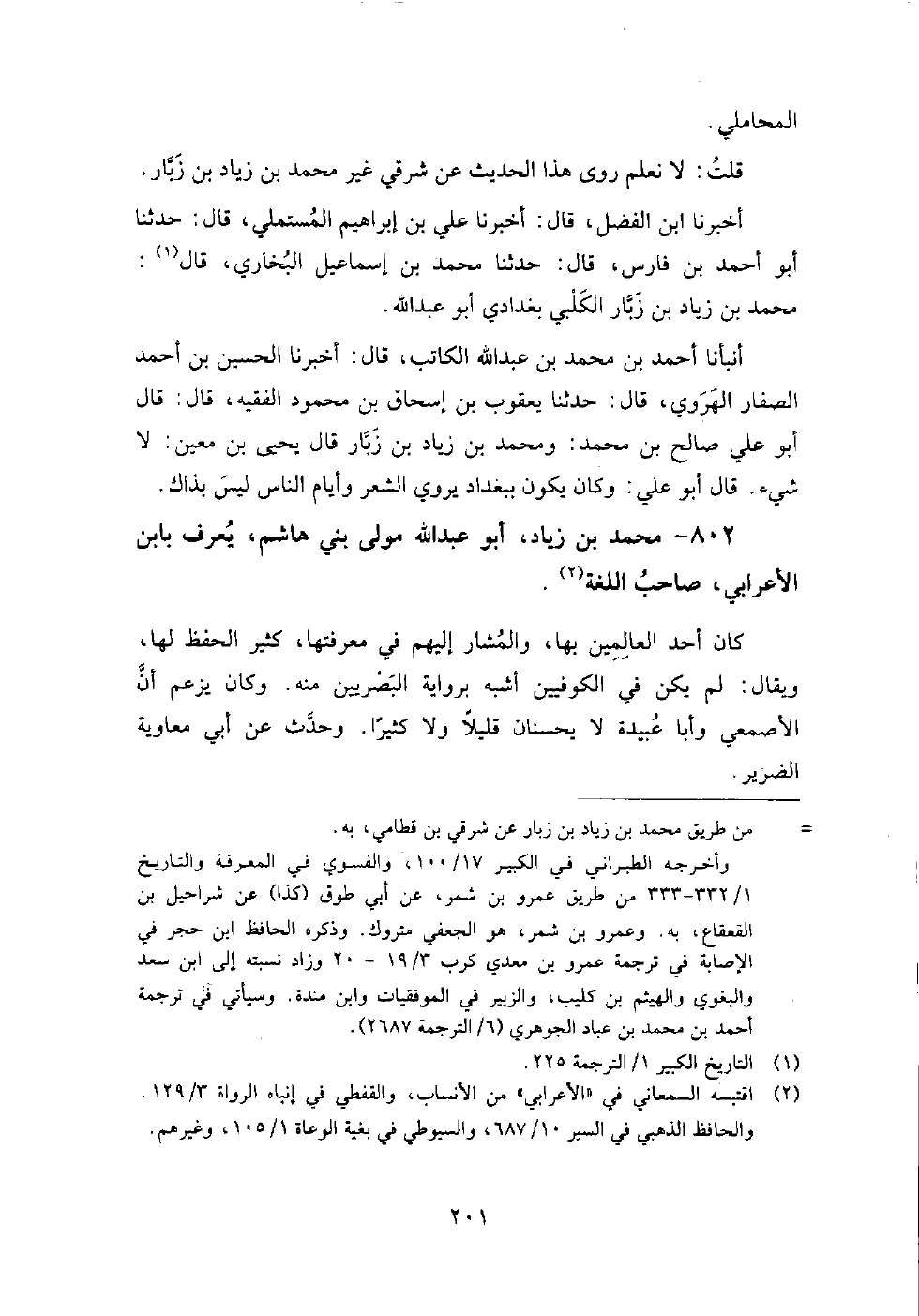 802 - محمد بن زياد أبو عبد الله مولى بني هاشم يعرف بابن الأعرابي صاحب اللغة كان أحمد العالمين بها، والمشار إليهم في معرفتها، كثير الحفظ لها، ويقال: لم يكن في الكوفيين أشبه برواية البصريين منه، وكان يزعم أن الأصمعي وأبا عبيدة لا يحسنان قليلا ولا كثيرا.