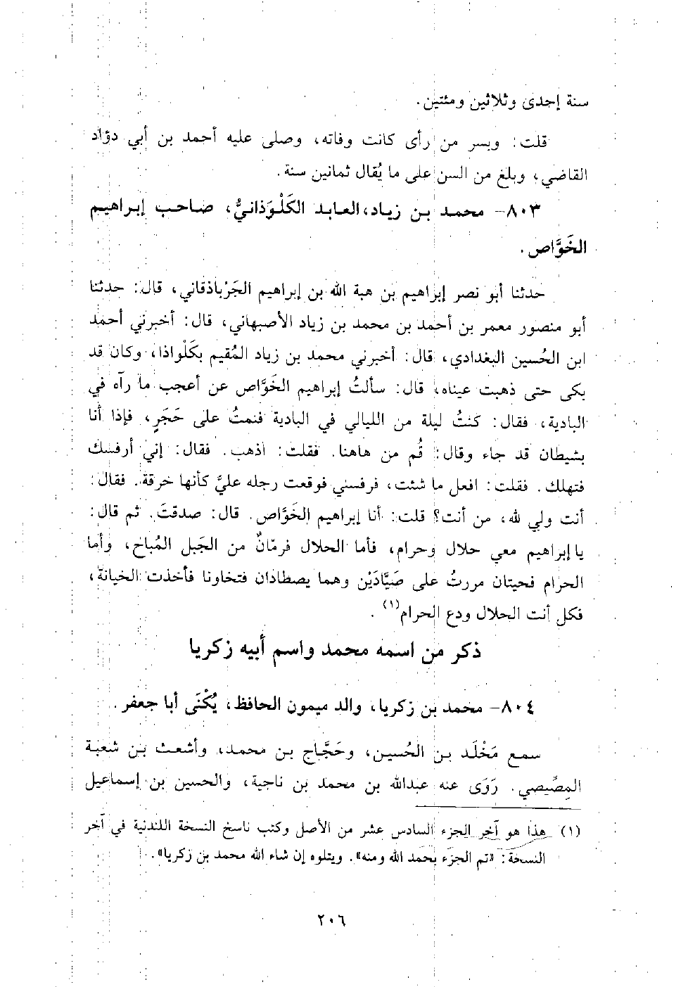 803 - محمد بن زياد العابد الكلوذاني صاحب إبراهيم الخواص حَدَّثَنَا أبو نصر إبراهيم بن هبة الله بن إبراهيم الجرباذقاني، قَالَ: حَدَّثَنَا أبو منصور معمر بن أحمد بن محمد بن زياد الأصبهاني، قَالَ: أَخْبَرَنِي أحمد بن الحسين البغدادي، قَالَ: أَخْبَرَنِي محمد بن زياد المقيم بكلواذا، وكان قد بكى حتى ذهبت عيناه، قَالَ: سألت إبراهيم الخواص عن أعجب ما رآه في البادية، فقال: كنت ليلة من الليالي في البادية فنمت على حجر، فإذا أنا بشيطان قد جاء، وَقَالَ: قم من ههنا.
