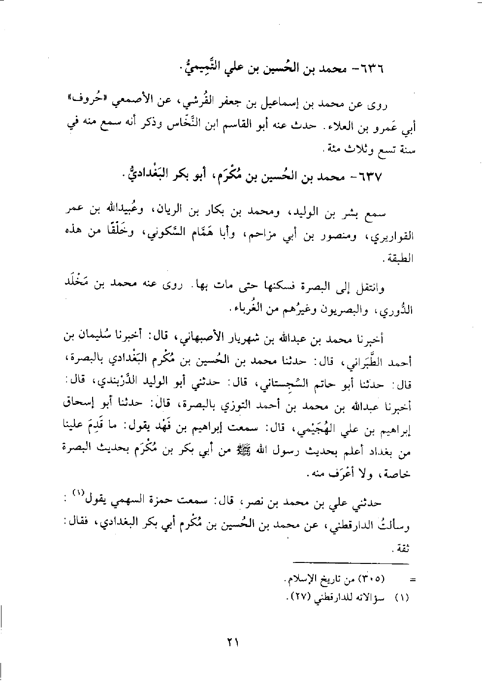 636 - محمد بن الحسين بن علي التميمي روى عن: محمد بن إسماعيل بن جعفر القرشي، عن الأصمعي حروف أبي عمرو بن العلاء، حدث عنه: أبو القاسم ابن النخاس، وذكر أنه سمع منه في سنة تسع وثلاث مائة.