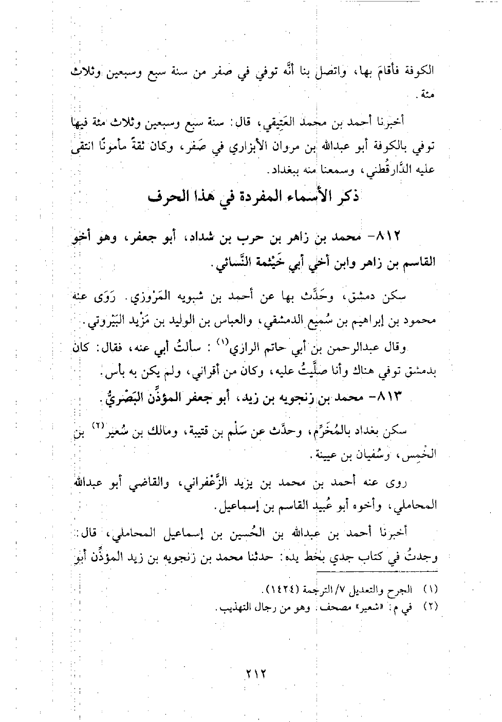 812 - محمد بن زاهر بن حرب بن شداد أبو جعفر وهو أخو القاسم بن زاهر وابن أخي أبي خيثمة النسائي سكن دمشق، وحدث بها عن: أحمد بن شبويه المروزي، روى عنه: محمود بن إبراهيم بن سميع الدمشقي، والعباس بن الوليد بن مزيد البيروتي.