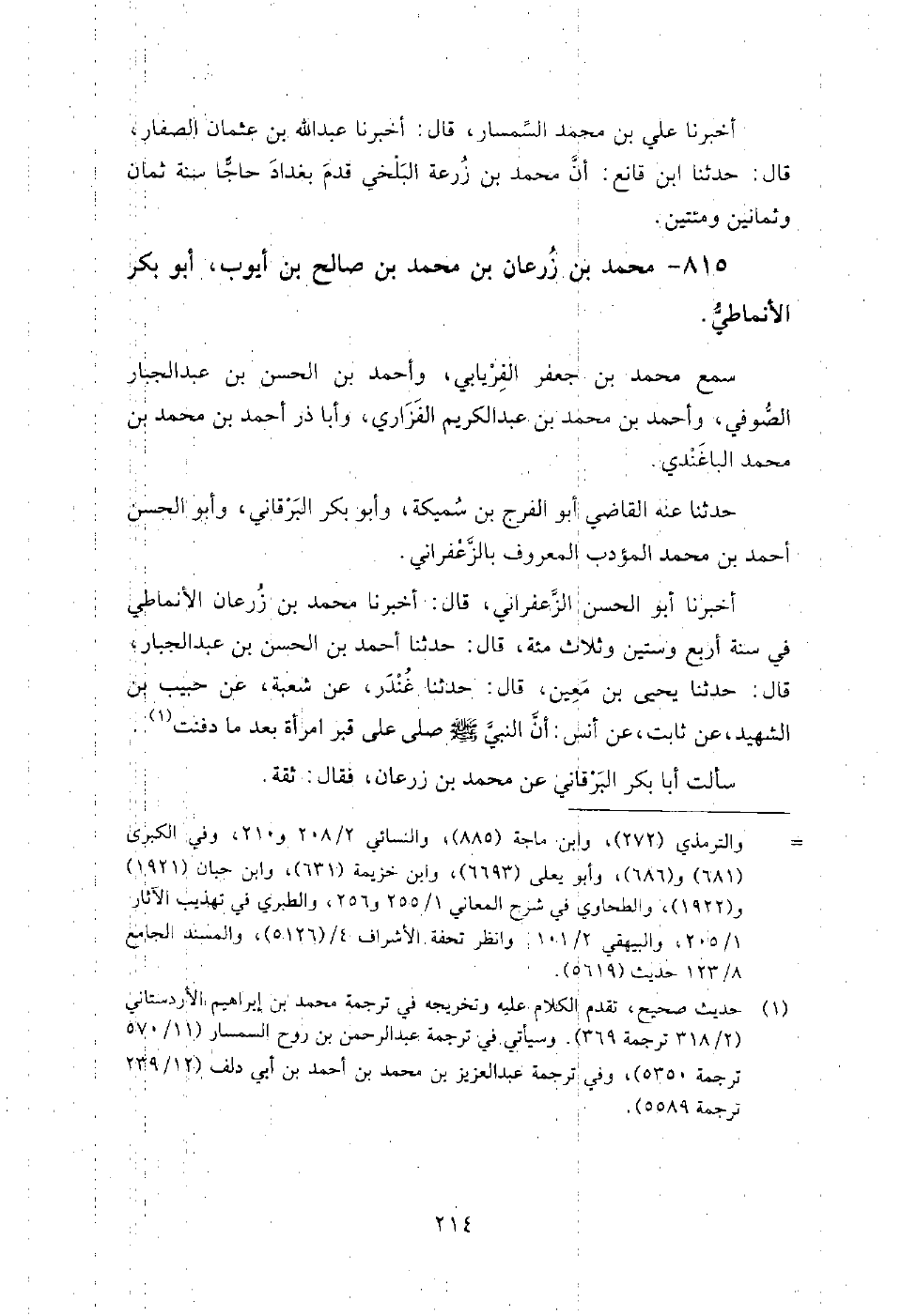 815 - محمد بن زرعان بن محمد بن صالح بن أيوب أبو بكر الأنماطي سمع: محمد بن جعفر الفريابي، وأحمد بن الحسن بن عبد الجبار الصوفي، وأحمد بن محمد بن عبد الكريم الفزاري، وأبا ذر أحمد بن محمد بن محمد الباغندي.