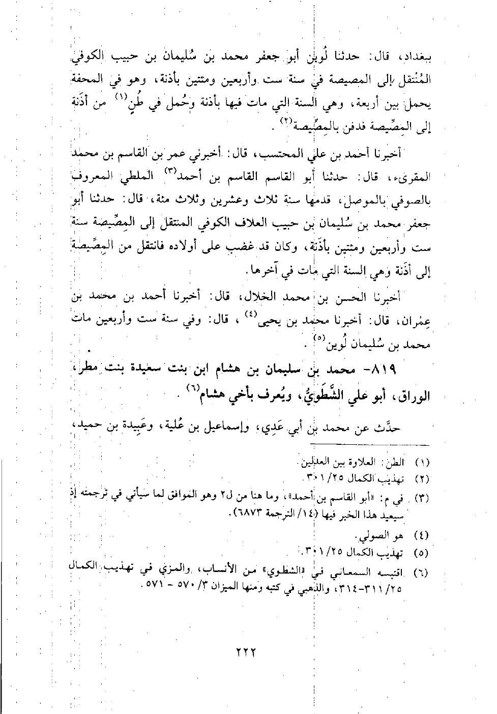 819 - محمد بن سليمان بن هشام ابن بنت سعيدة بنت مطر الوراق أبو علي الشطوي ويعرف بأخي هشام حدث عن: محمد بن أبي عدي، وإسماعيل ابن علية، وعبيدة بن حميد، والمحاربي، ووكيع، وأبي معاوية الضرير، وأبي أسامة حماد بن أسامة.