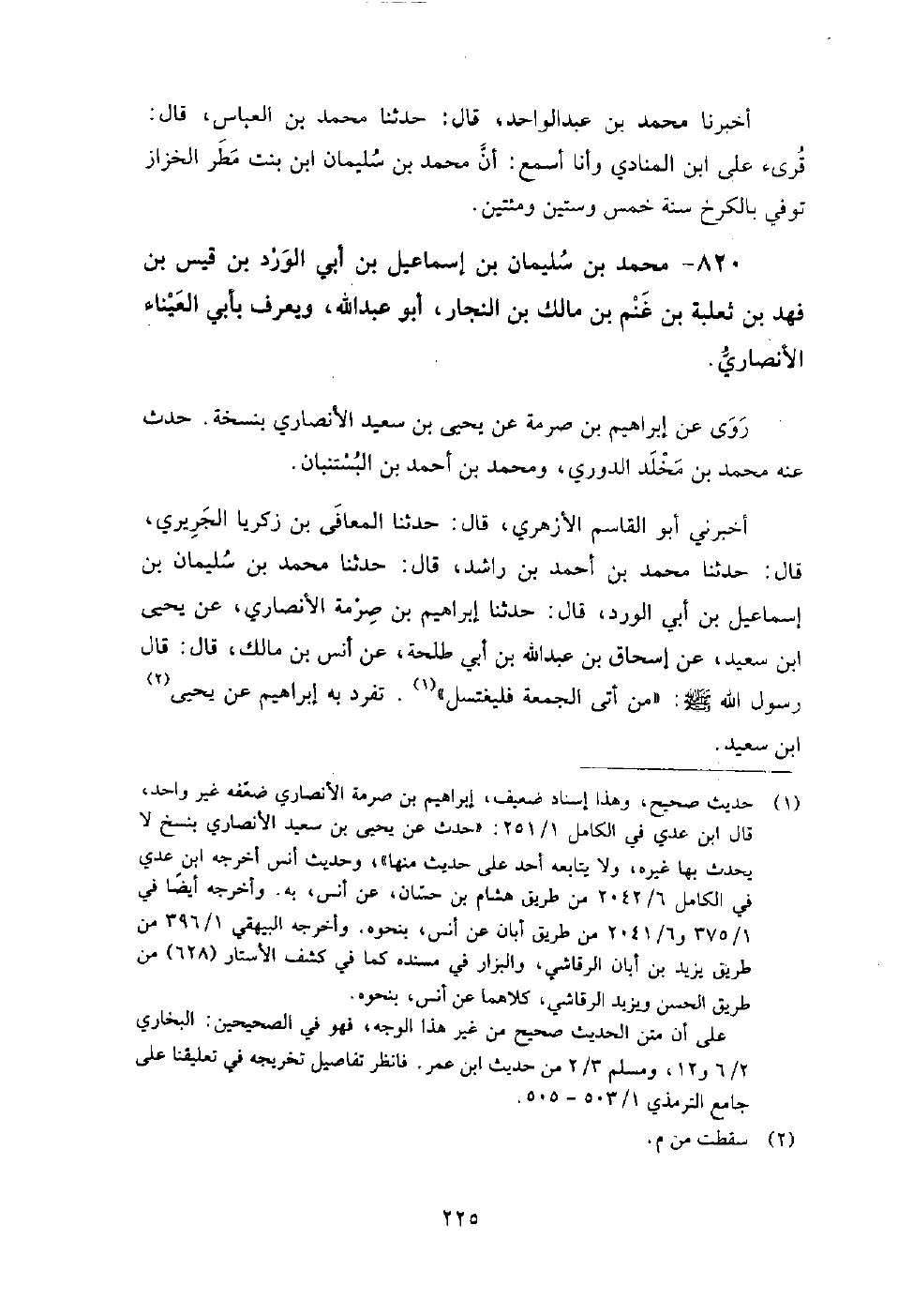 820 - محمد بن سليمان بن إسماعيل بن أبي الورد بن قيس بن فهد بن ثعلبة بن غنم بن مالك بن النجار أبو عبد الله ويعرف بأبي العيناء الأنصاري روى عن: إبراهيم بن صرمة، عن يحيى بن سعيد الأنصاري بنسخة، حدث عنه: محمد بن مخلد الدوري، ومحمد بن أحمد بن البستنبان.