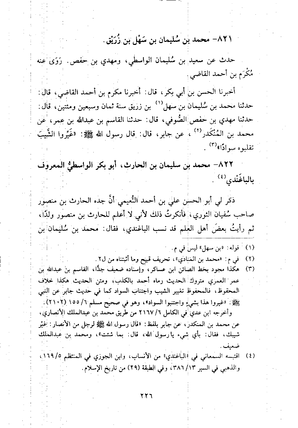 822 - محمد بن سليمان بن الحارث أبو بكر الواسطي المعروف بالباغندي ذكر لي أبو الحسن علي بن أحمد النعيمي أن جده الحارث بن منصور صاحب سفيان الثوري، فأنكرت ذلك؛ لأني لا أعلم للحارث بن منصور ولدا، ثم رأيت بعض أهل العلم قد نسب الباغندي، فقال: محمد بن سليمان بن الحارث بن عبد الرحمن الأزدي.
