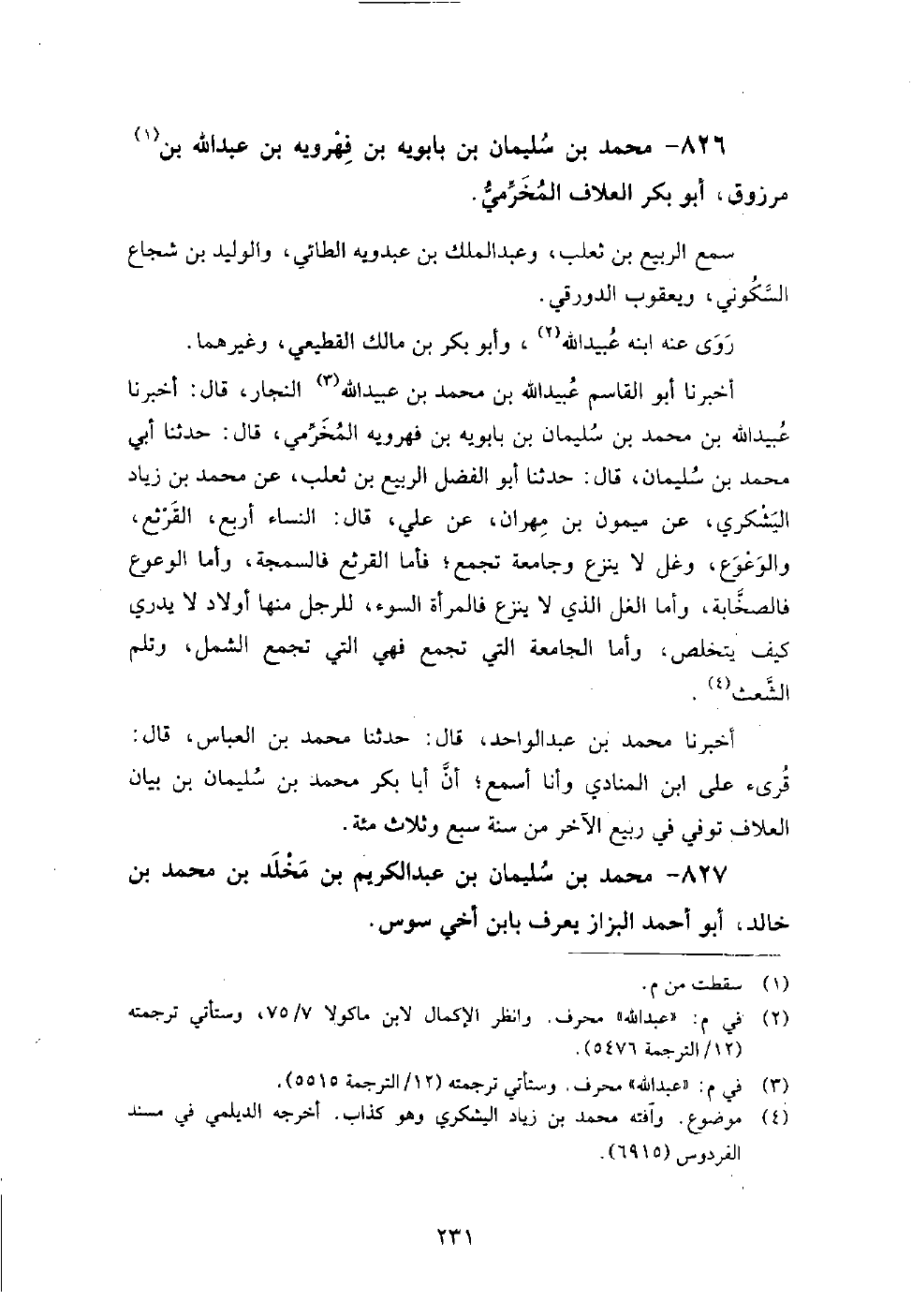 826 - محمد بن سليمان بن بابويه بن فهرويه بن عبد الله بن مرزوق أبو بكر العلاف المخرمي سمع: الربيع بن ثعلب، وعبد الملك بن عبدويه الطائي، والوليد بن شجاع السكوني، ويعقوب الدورقي.
