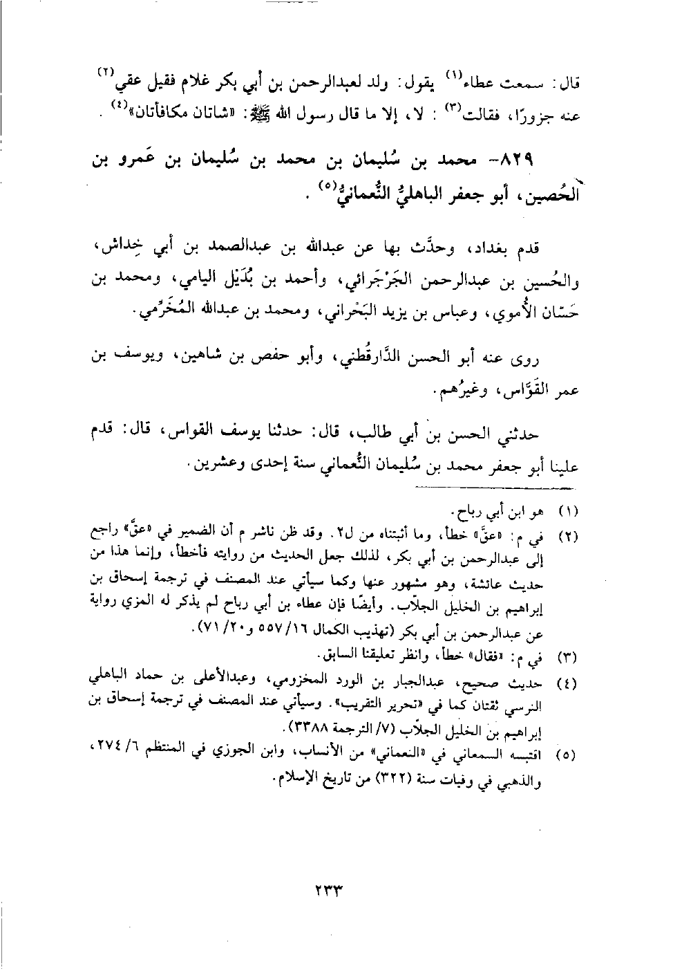 829 - محمد بن سليمان بن محمد بن سليمان بن عمرو بن الحصين أبو جعفر الباهلي النعماني قدم بغداد، وحدث بها عن: عبد الله بن عبد الصمد بن أبي خداش، والحسين بن عبد الرحمن الجرجرائي، وأحمد بن بديل اليامي، ومحمد بن حسان الأموي، وعباس بن يزيد البحراني، ومحمد بن عبد الله المخرمي.