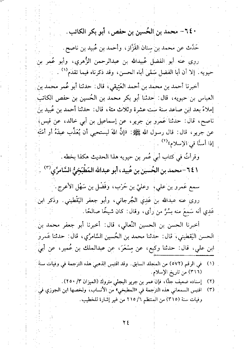 641 - محمد بن الحسين بن عبيد أبو عبد الله المطبخي السامري سمع: عمرو بن علي، وعلي بن حرب، وفضل بن سهل الأعرج.