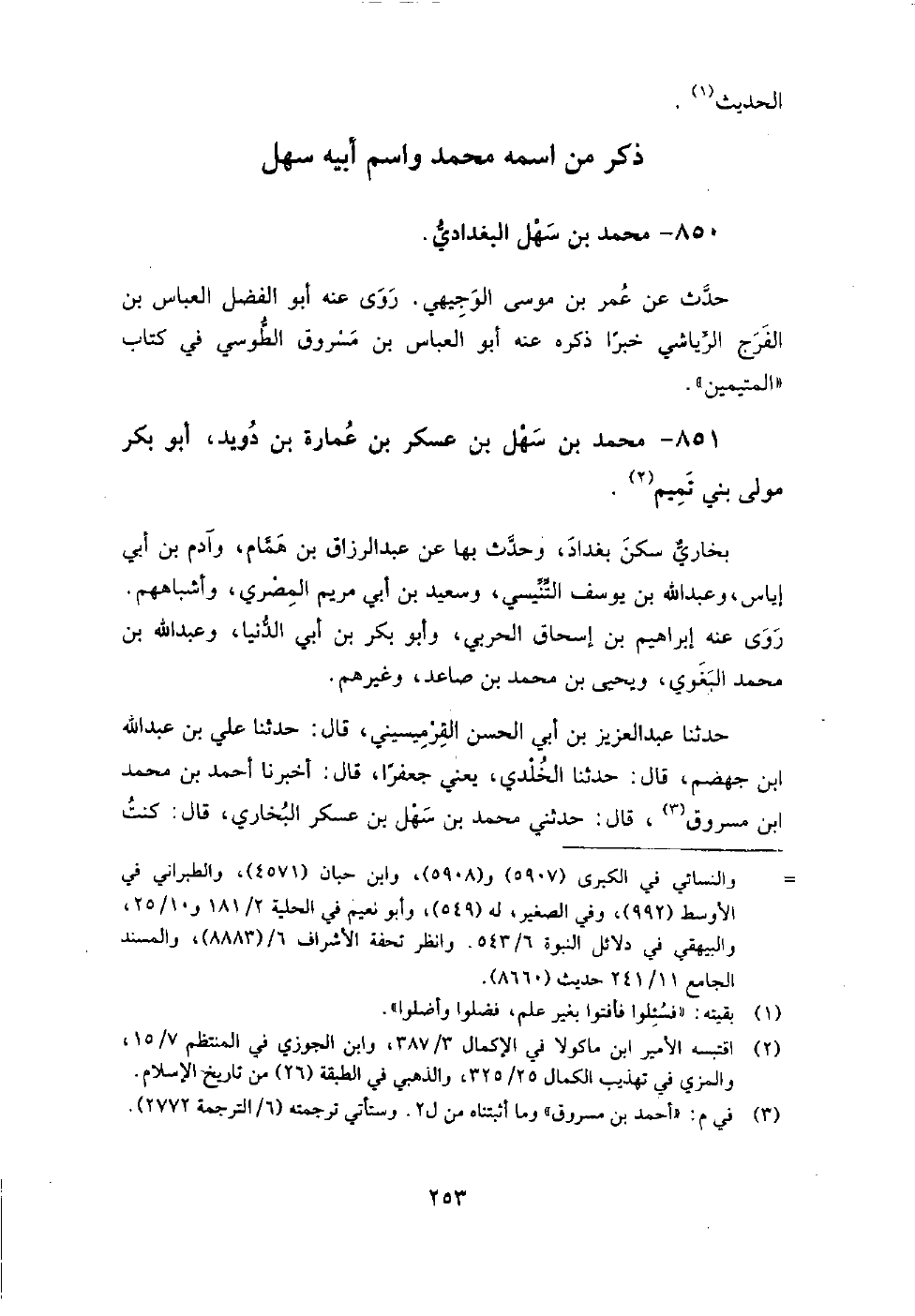851 - محمد بن سهل بن عسكر بن عمارة بن دويد أبو بكر مولى بني تميم بخاري سكن بغداد، وحدث بها عن: عبد الرزاق بن همام، وآدم بن أبي إياس، وعبد الله بن يوسف التنيسي، وسعيد بن أبي مريم المصري، وأشباههم.
