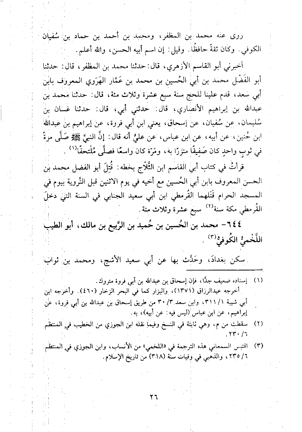 644 - محمد بن الحسين بن حميد بن الربيع بن مالك أبو الطيب اللخمي الكوفي سكن بغداد، وحدث بها عن: أبي سعيد الأشج، ومحمد بن ثواب الهباري، وجده حميد بن الربيع، وهارون بن إسحاق الهمداني، والخضر بن أبان الهاشمي، ومحمد بن الحجاج الضبي، وإبراهيم بن أبي العنبس القاضي، وأحمد بن حازم الغفاري، وغيرهم.