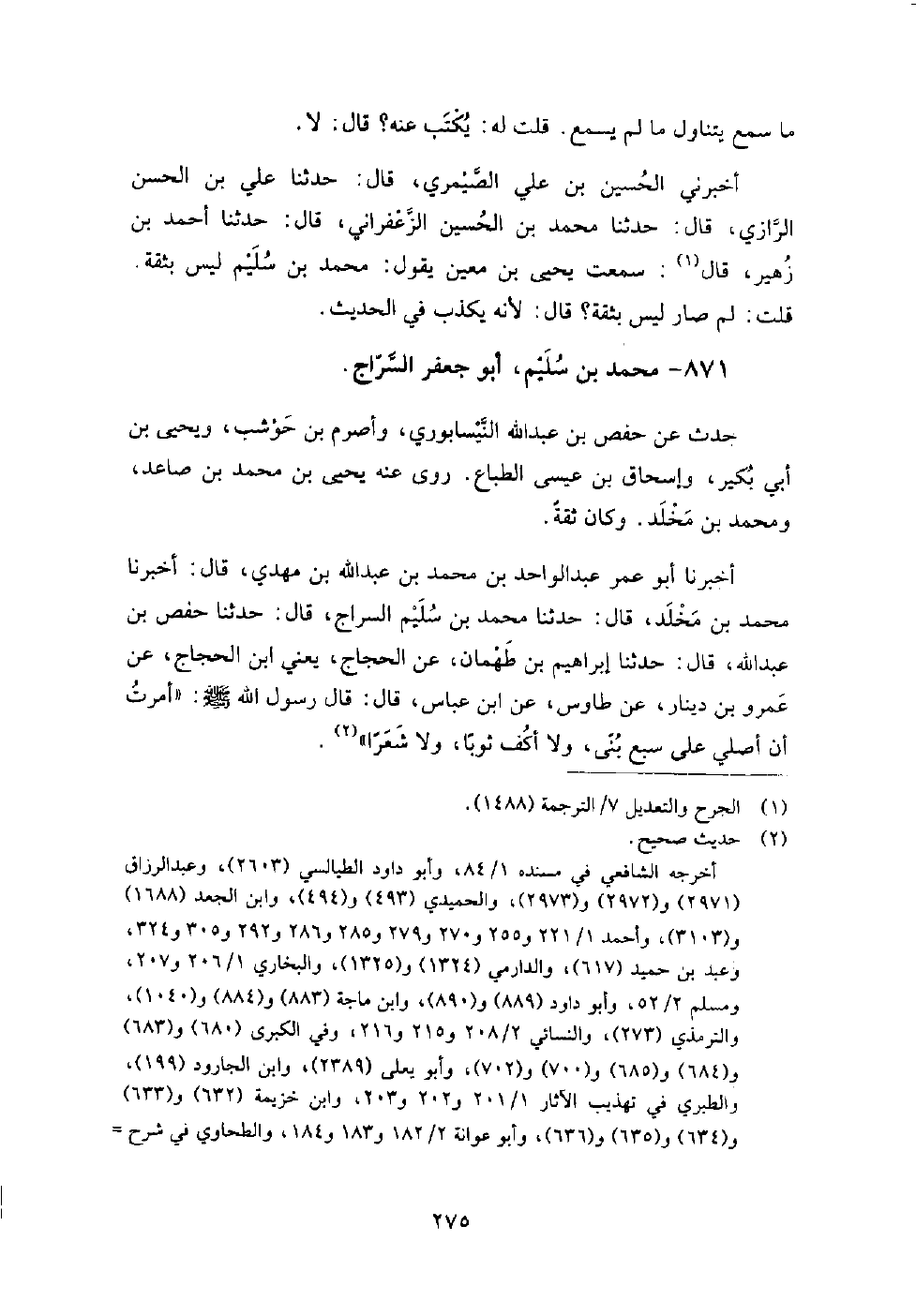 871 - محمد بن سليم أبو جعفر السراج حدث عن: حفص بن عبد الله النيسابوري، وأصرم بن حوشب، ويحيى بن أبي بكير، وإسحاق بن عيسى الطباع.