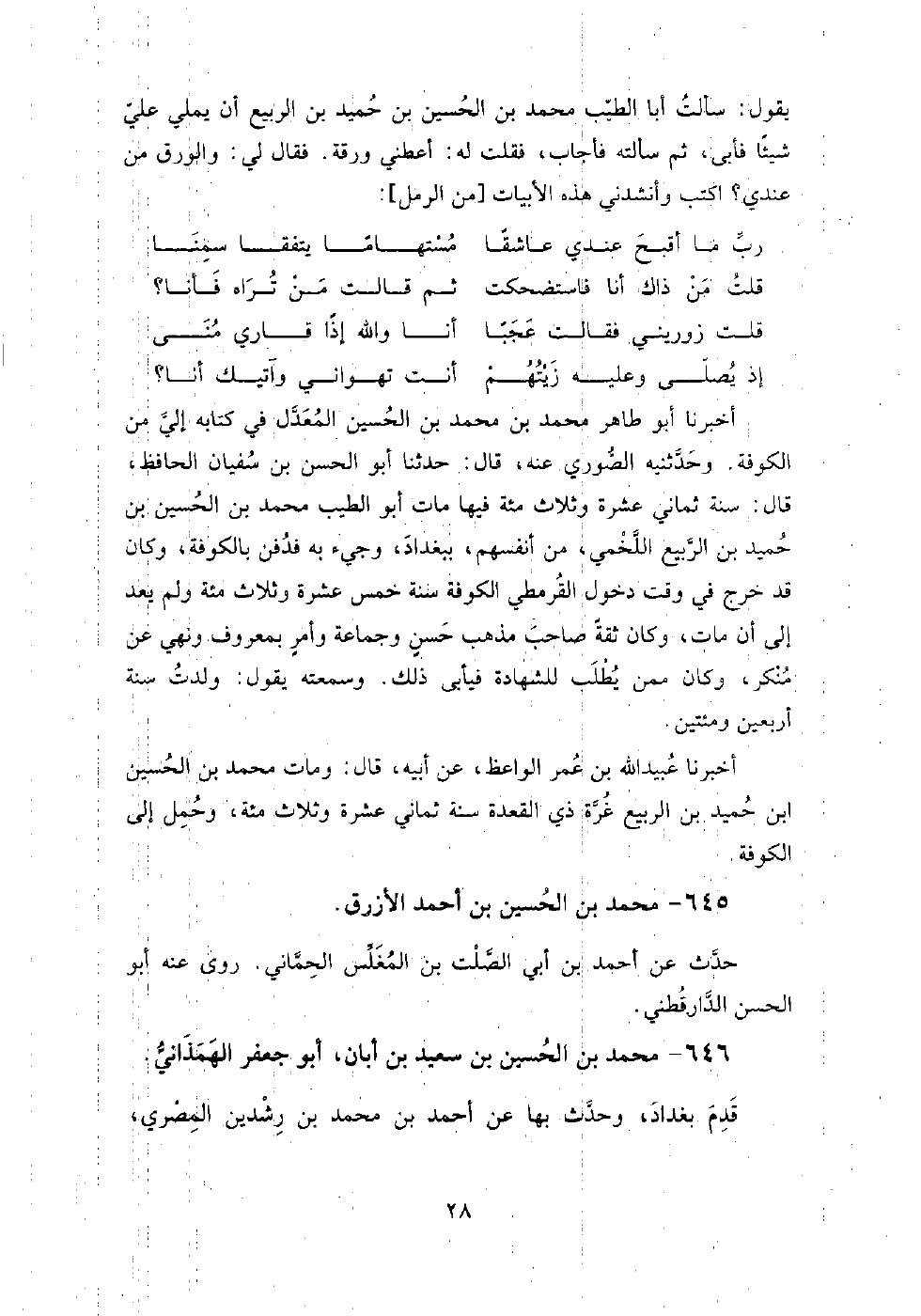 646 - محمد بن الحسين بن سعيد بن أبان أبو جعفر الهمذاني قدم بغداد، وحدث بها عن: أحمد بن محمد بن رشدين المصري، ومحمد بن مشكان الأنطاكي، وعبد الله بن أحمد بن أبي مسرة المكي، وغيرهم.
