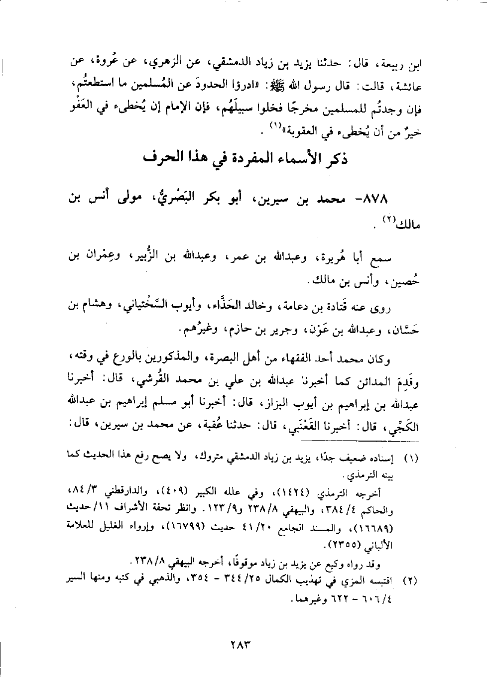 878 - محمد بن سيرين أبو بكر البصري مولى أنس بن مالك سمع: أبا هريرة، وعبد الله بن عمر، وعبد الله بن الزبير، وعمران بن حصين، وأنس بن مالك.
