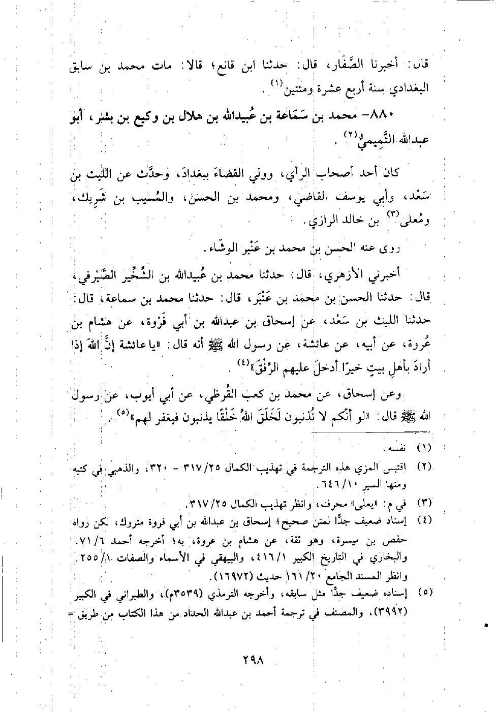 880 - محمد بن سماعة بن عبيد الله بن هلال بن وكيع بن بشر أبو عبد الله التميمي: كان أحد أصحاب الرأي، وولي القضاء ببغداد، وحدث عن: الليث بن سعد، وأبي يوسف القاضي، ومحمد بن الحسن، والمسيب بن شريك، ومعلى بن خالد الرازي.